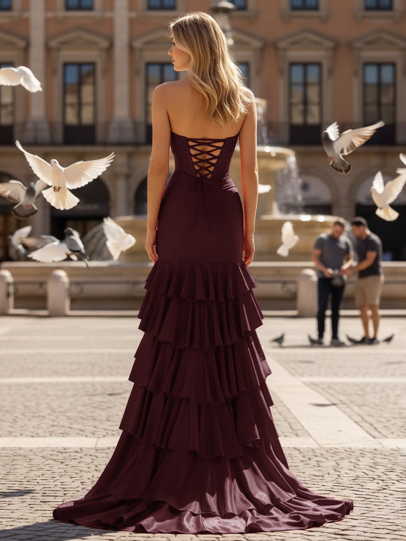 Ruched Pleated Ruffle Lace Up Bodice Long Mermaid Prom Dress - Burgundy