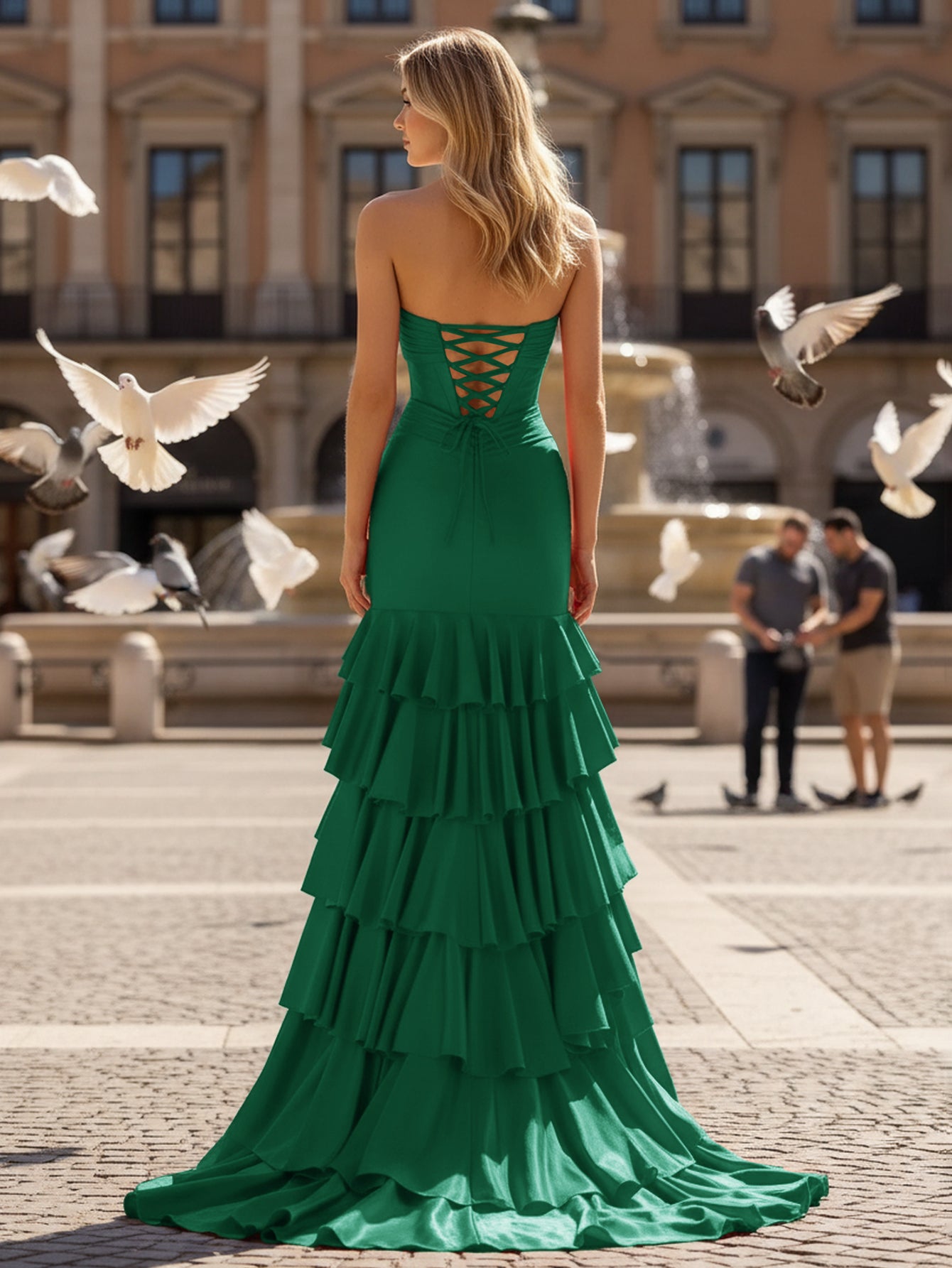 Ruched Pleated Ruffle Lace Up Bodice Long Mermaid Prom Dress - Emerald Green