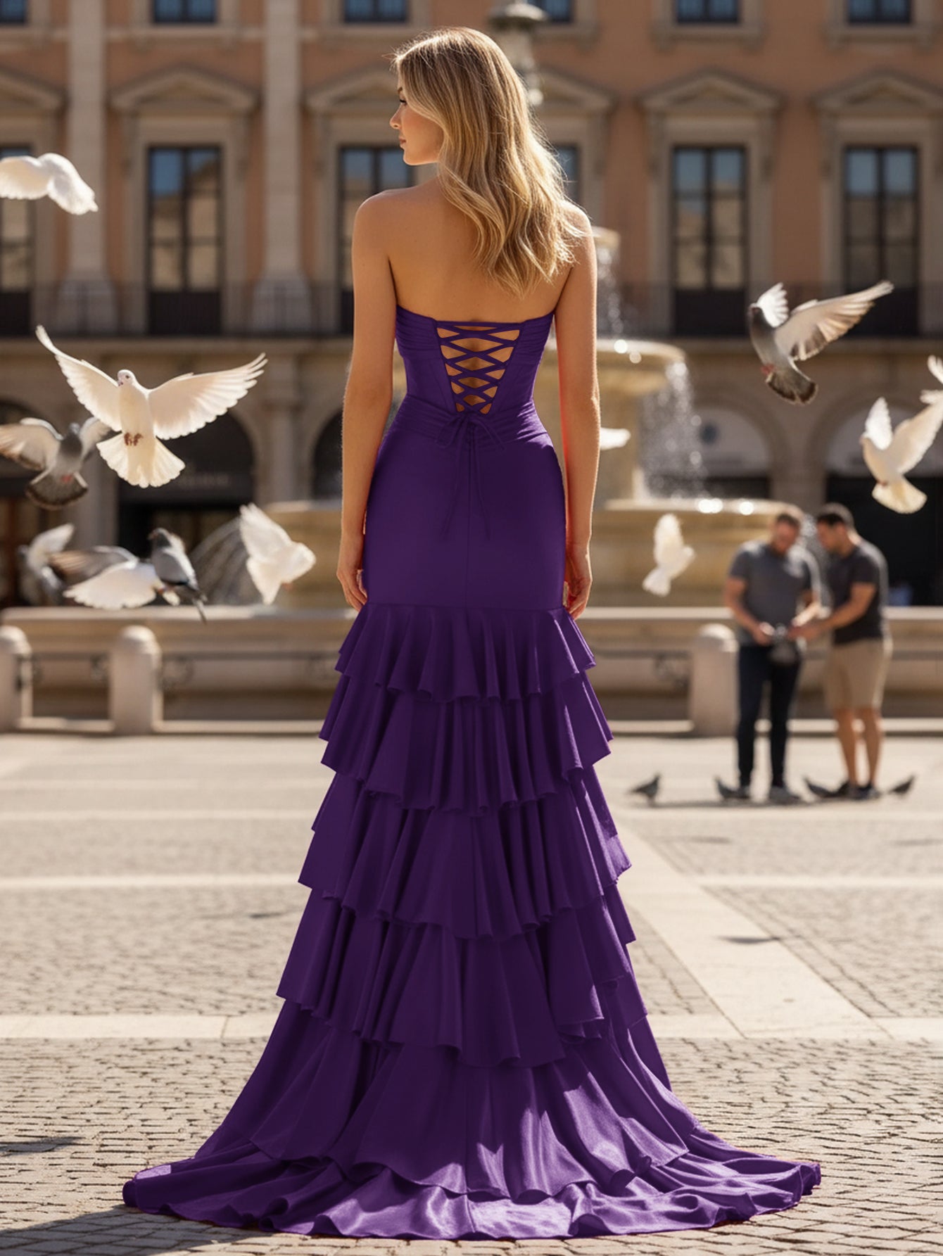 Ruched Pleated Ruffle Lace Up Bodice Long Mermaid Prom Dress - Purple