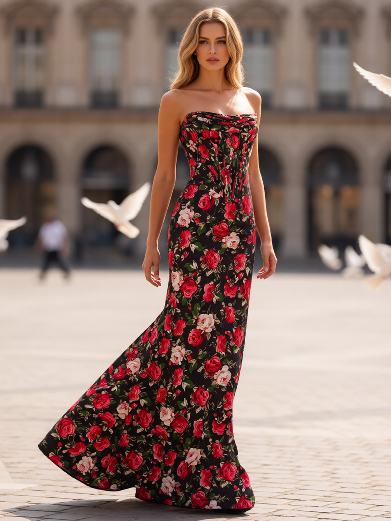 Ruched Strapless Lace Up Bodice Long Mermaid Prom Dress - Black Floral
