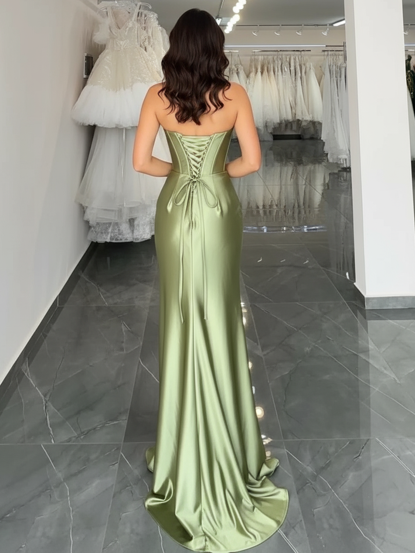 Ruched Strapless Lace Up Bodice Mermaid Long Prom Dress With Slit - Sage Green