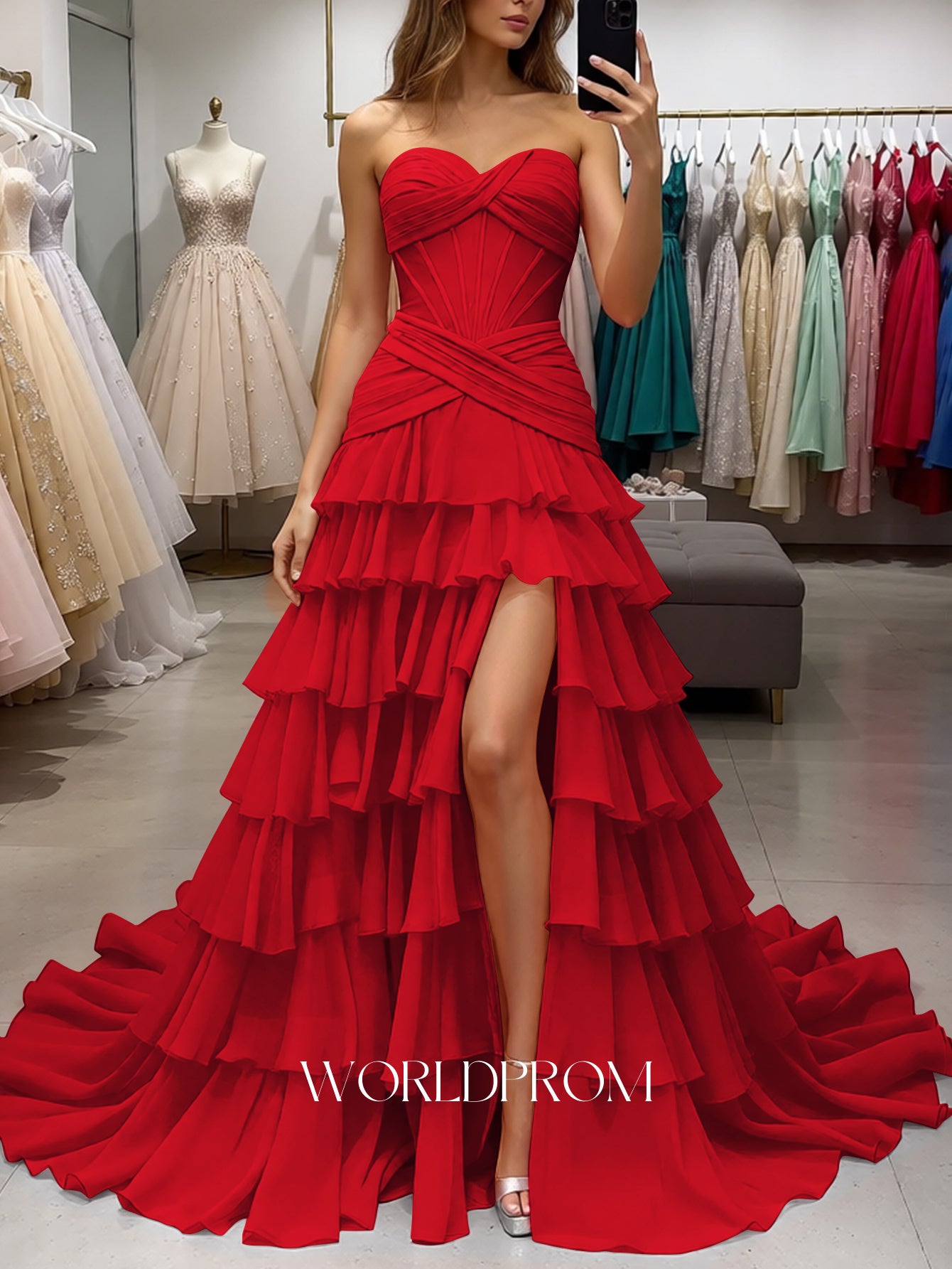 This satin prom gown features ruched bust on the bodice. The strapless dress has a sweetheart neckline and ruffled hem. Worldprom a-line prom dresses are ideal for party, evening or festivals.