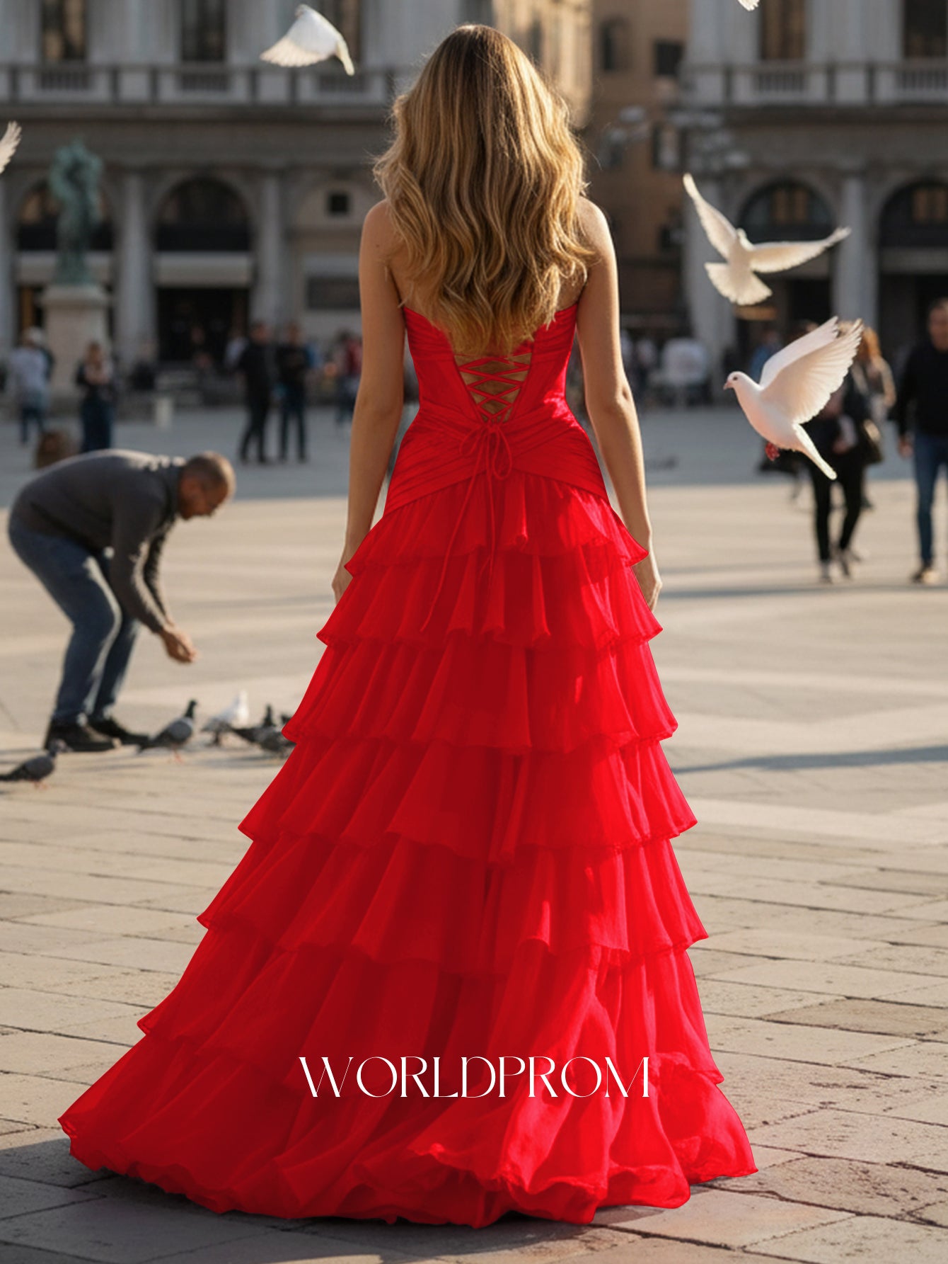 Ruffle Ruched Lace Up Bodice Long A-Line Prom Dress - Red