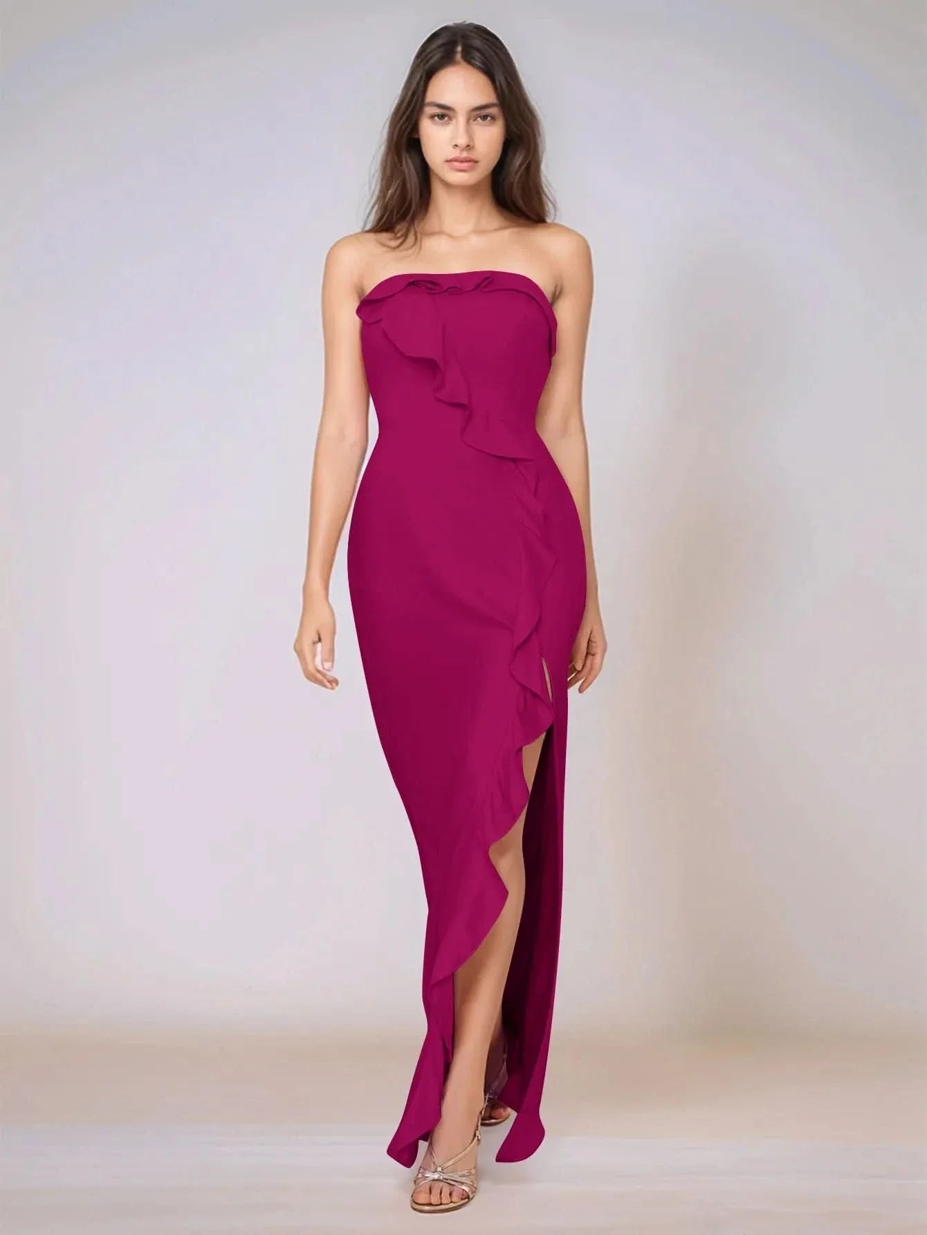 Details: Backless, Fitted Waist, Ruffle, Split, Ruffle Side