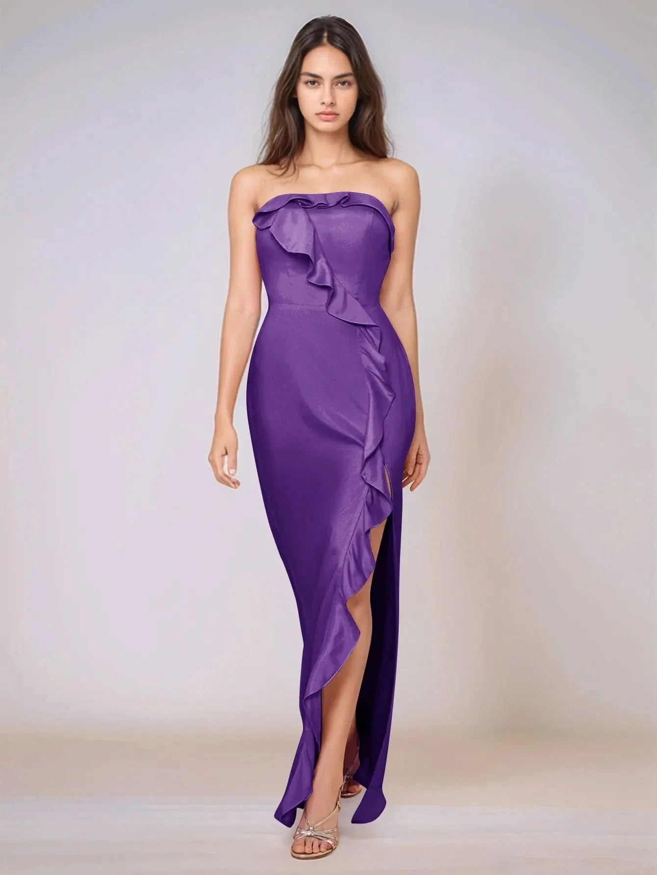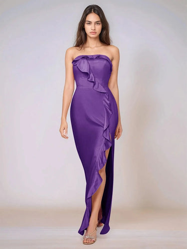 Ruffle Side Split Acetate Satin Bridesmaid Dress - Purple