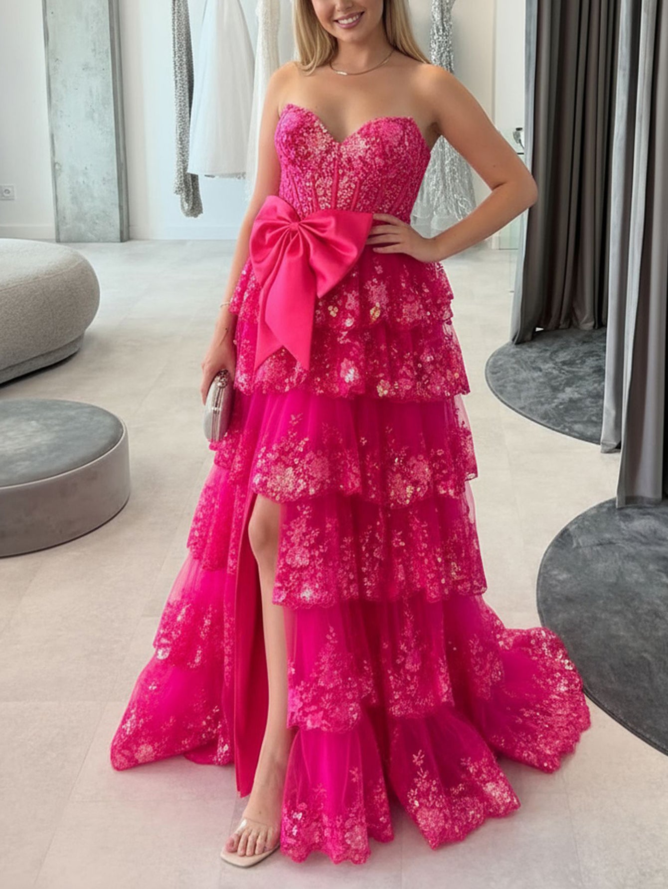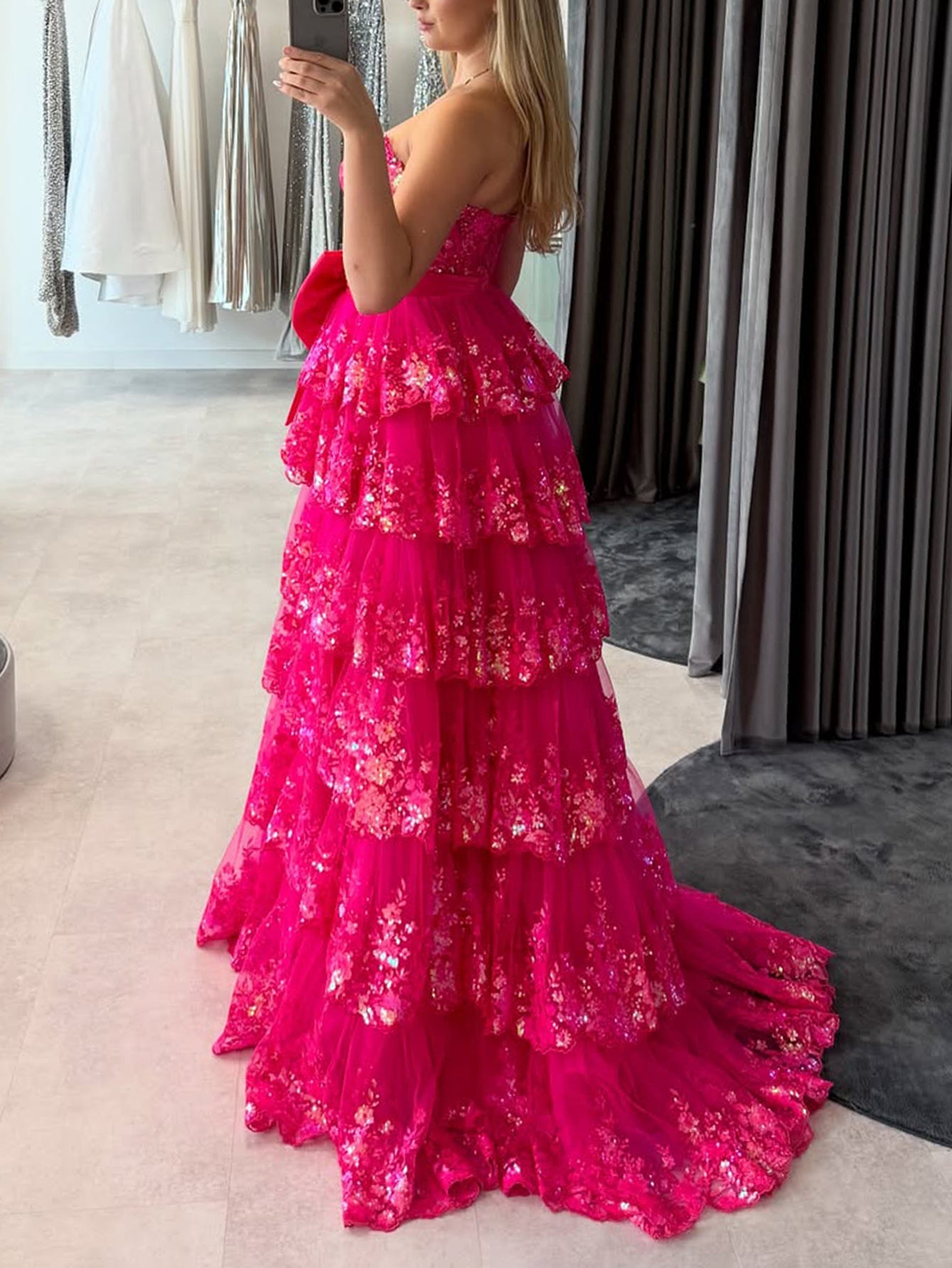 Satin Bow Waist Sparkly Lace Strapless Ruffle Tiered Prom Dress - Hot Pink