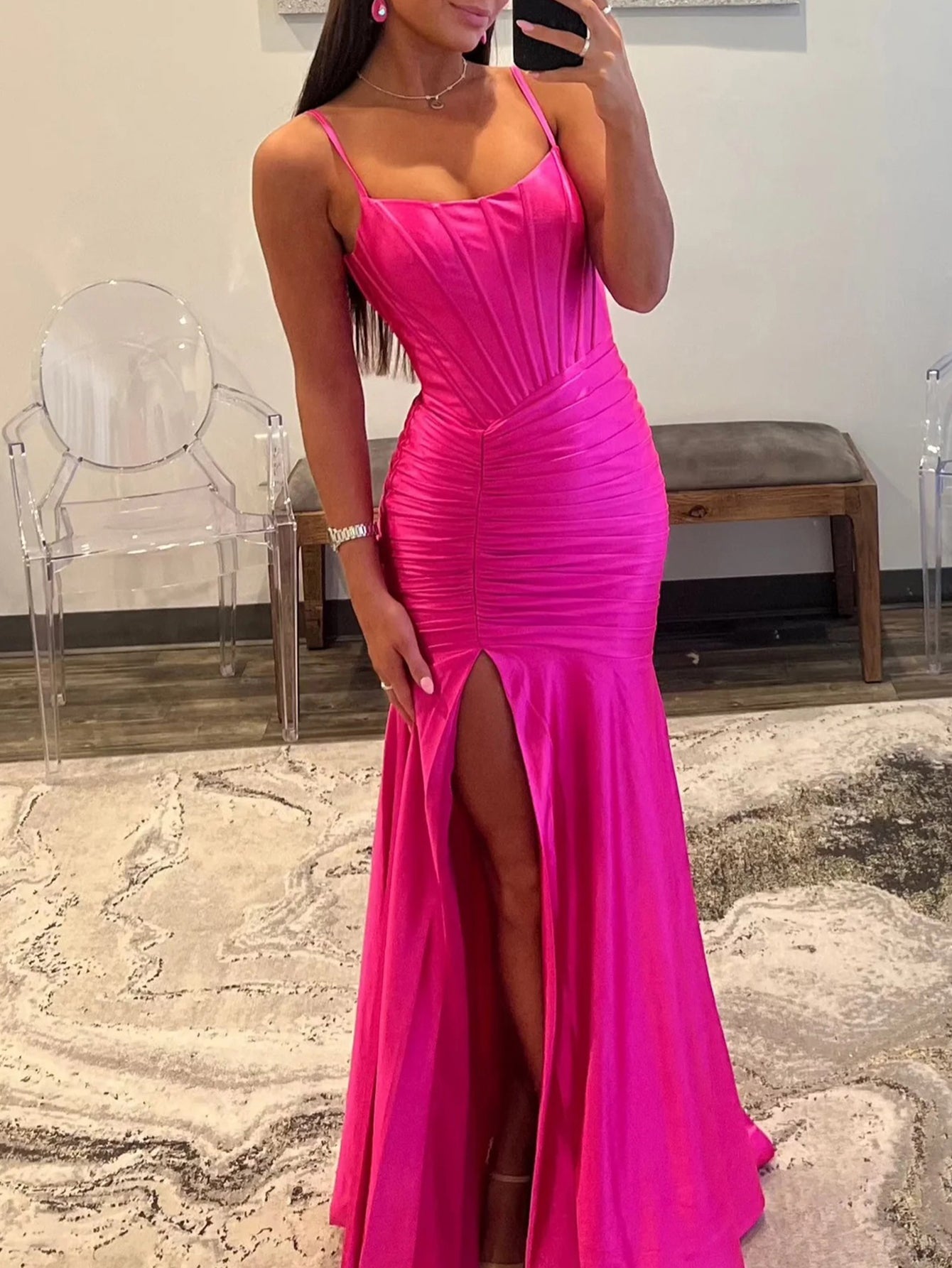 Scoop Boned Mermaid Prom Dress With Slit - Hot Pink