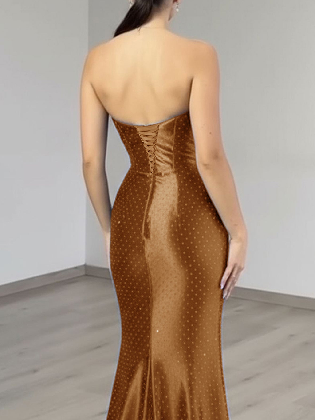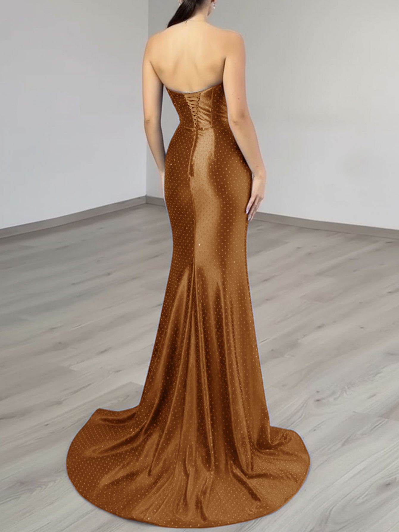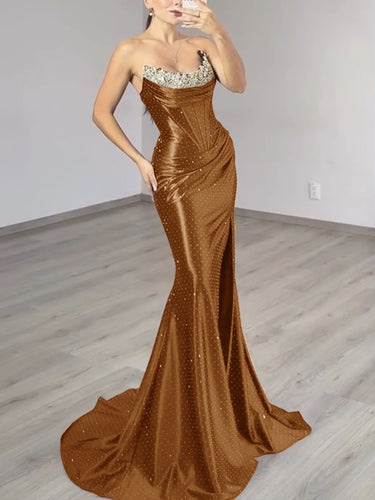 This luxury evening dress features satin with crystal on the bust. The strapless prom dress has a scoop neck and split hem. This dubai sexy evening dress is ideal for party, evening or homecoming events.