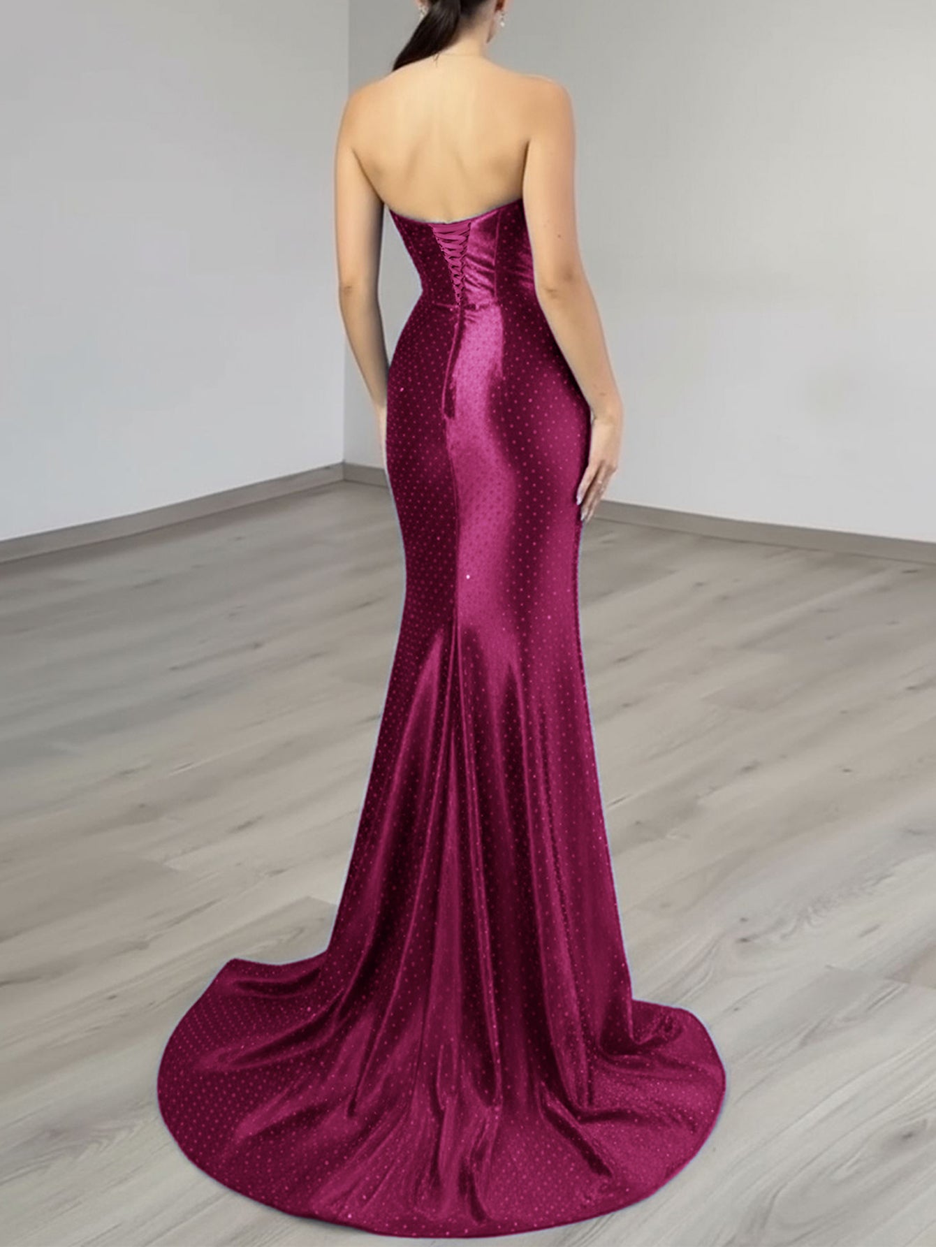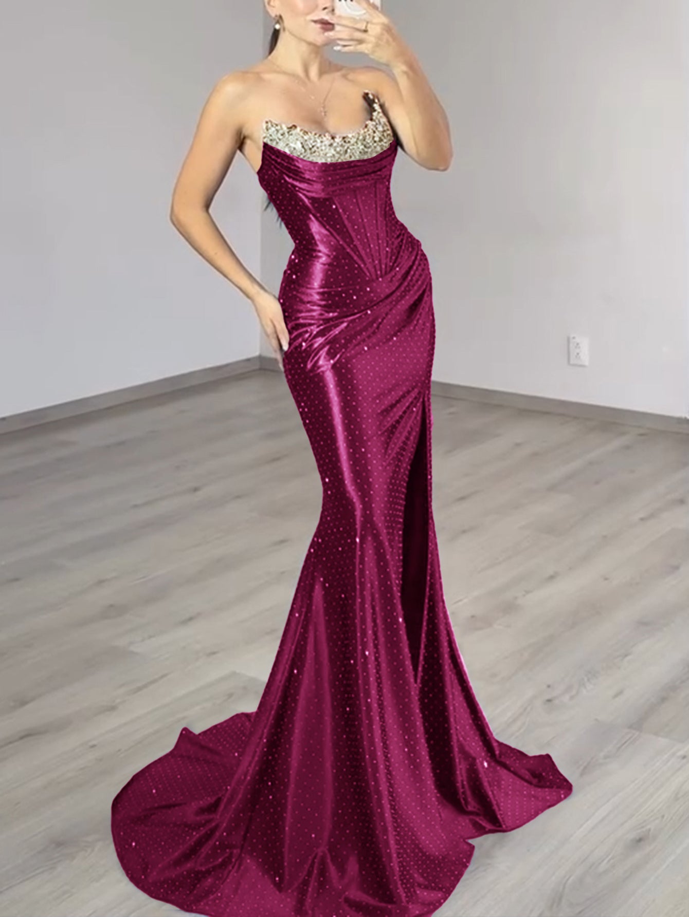 This luxury evening dress features satin with crystal on the bust. The strapless prom dress has a scoop neck and split hem. This dubai sexy evening dress is ideal for party, evening or homecoming events.