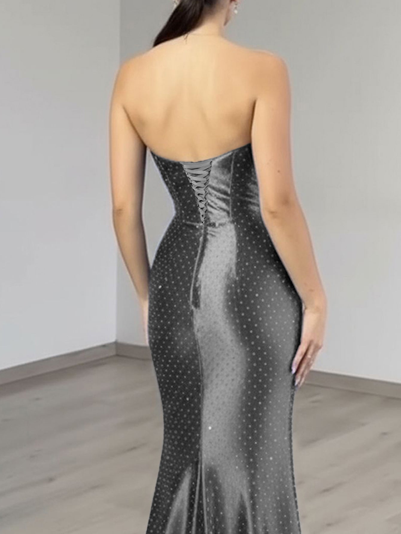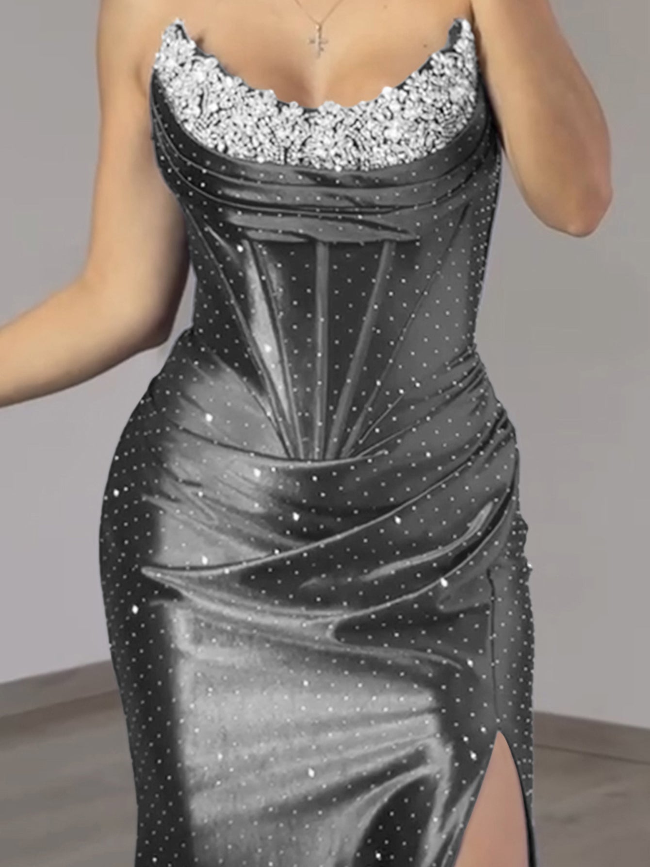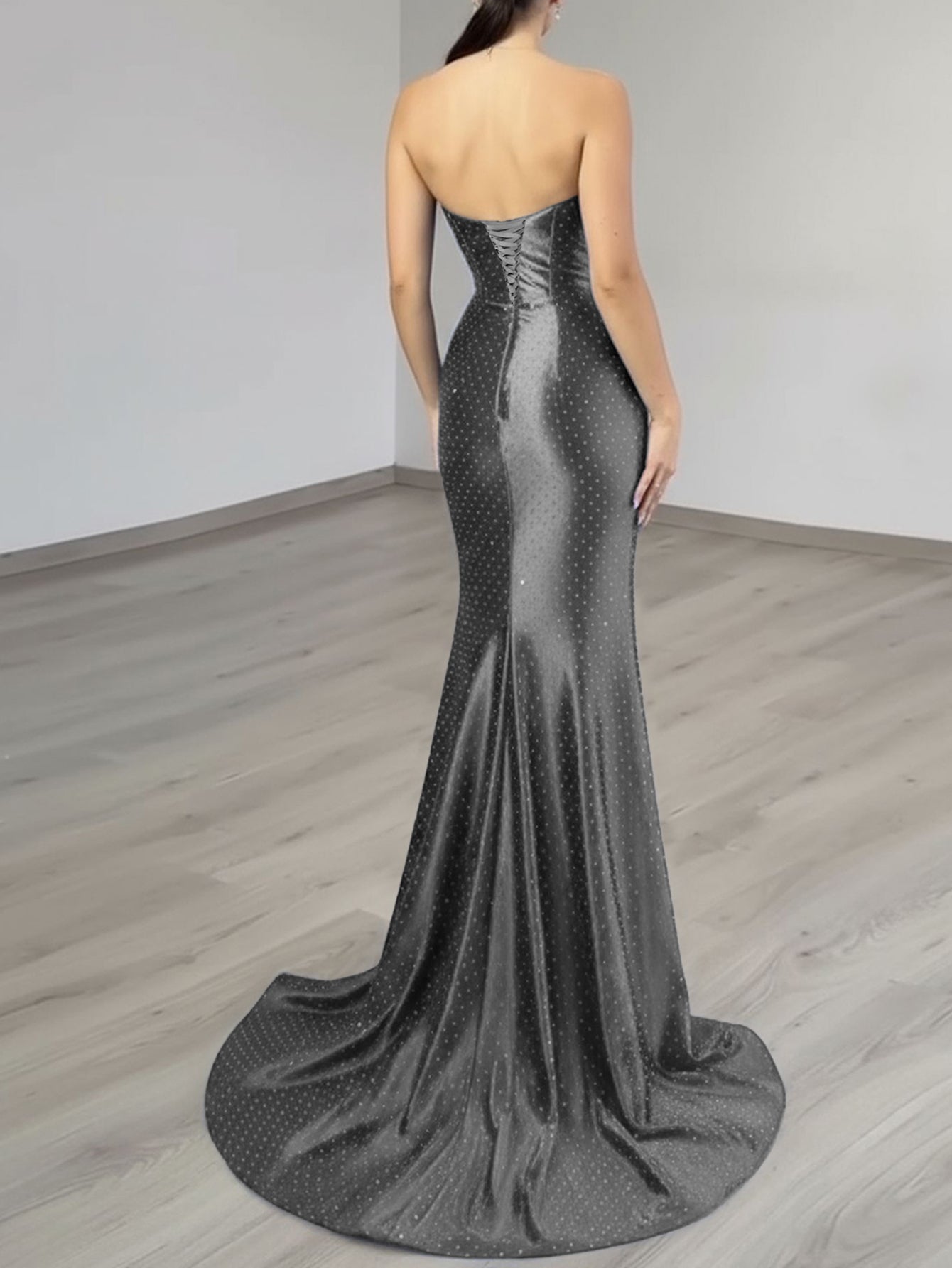 This luxury evening dress features satin with crystal on the bust. The strapless prom dress has a scoop neck and split hem. This dubai sexy evening dress is ideal for party, evening or homecoming events.