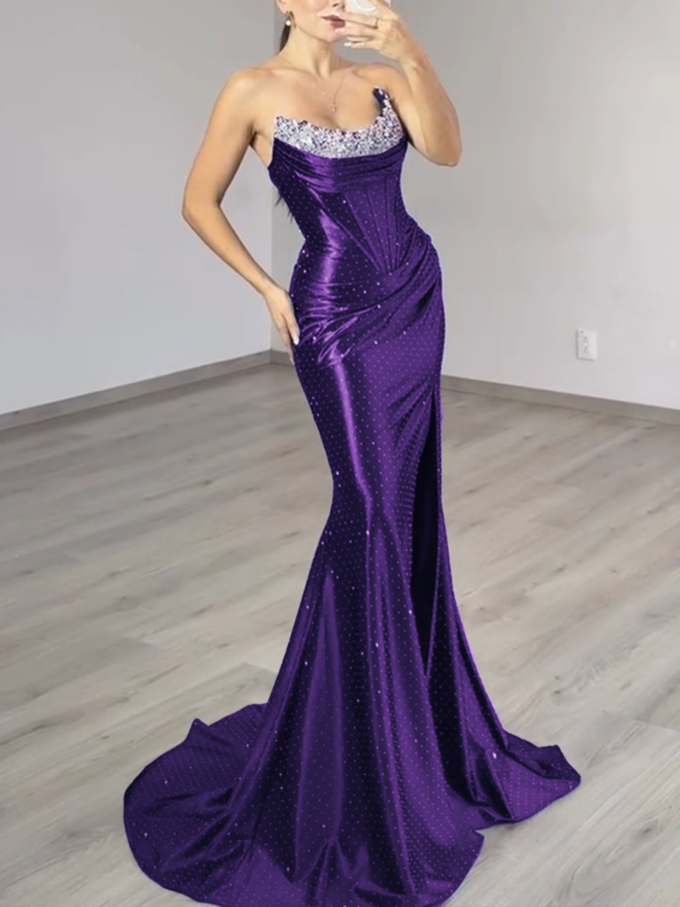 This luxury evening dress features satin with crystal on the bust. The strapless prom dress has a scoop neck and split hem. This dubai sexy evening dress is ideal for party, evening or homecoming events.