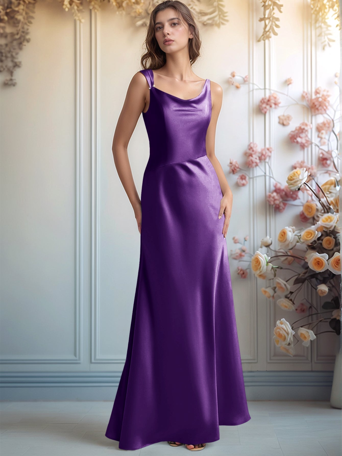 This satin bridesmaid dress features fitted waist on the bodice. The plain maxi dress has a scoop neck and pleated hem. The sheath bridesmaid formal dress is ideal for beach, outdoor wedding or garden wedding guest party.