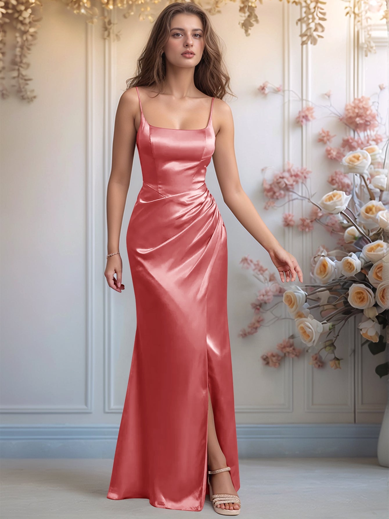 Scoop Waist Pleats Sheath Satin Bridesmaid Dress With Split - Coral