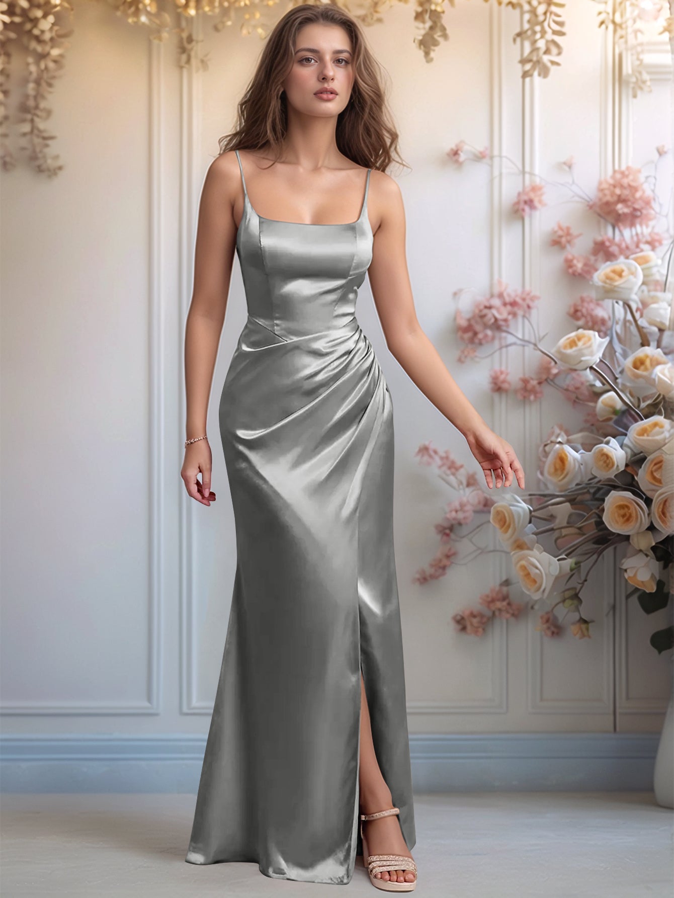 Scoop Waist Pleats Sheath Satin Bridesmaid Dress With Split - Grey