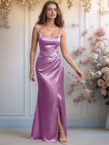 Scoop Waist Pleats Sheath Satin Bridesmaid Dress With Split - Lilac