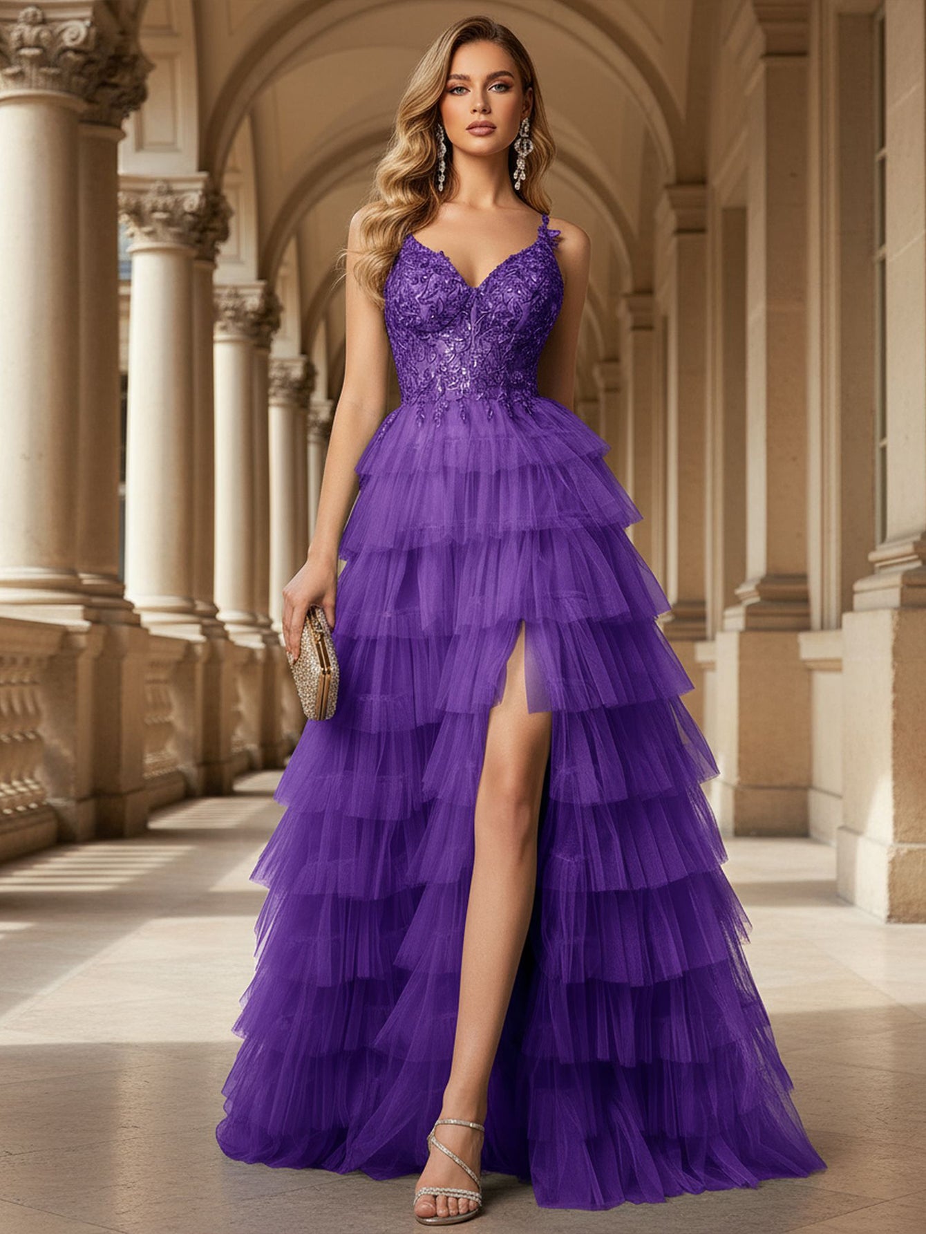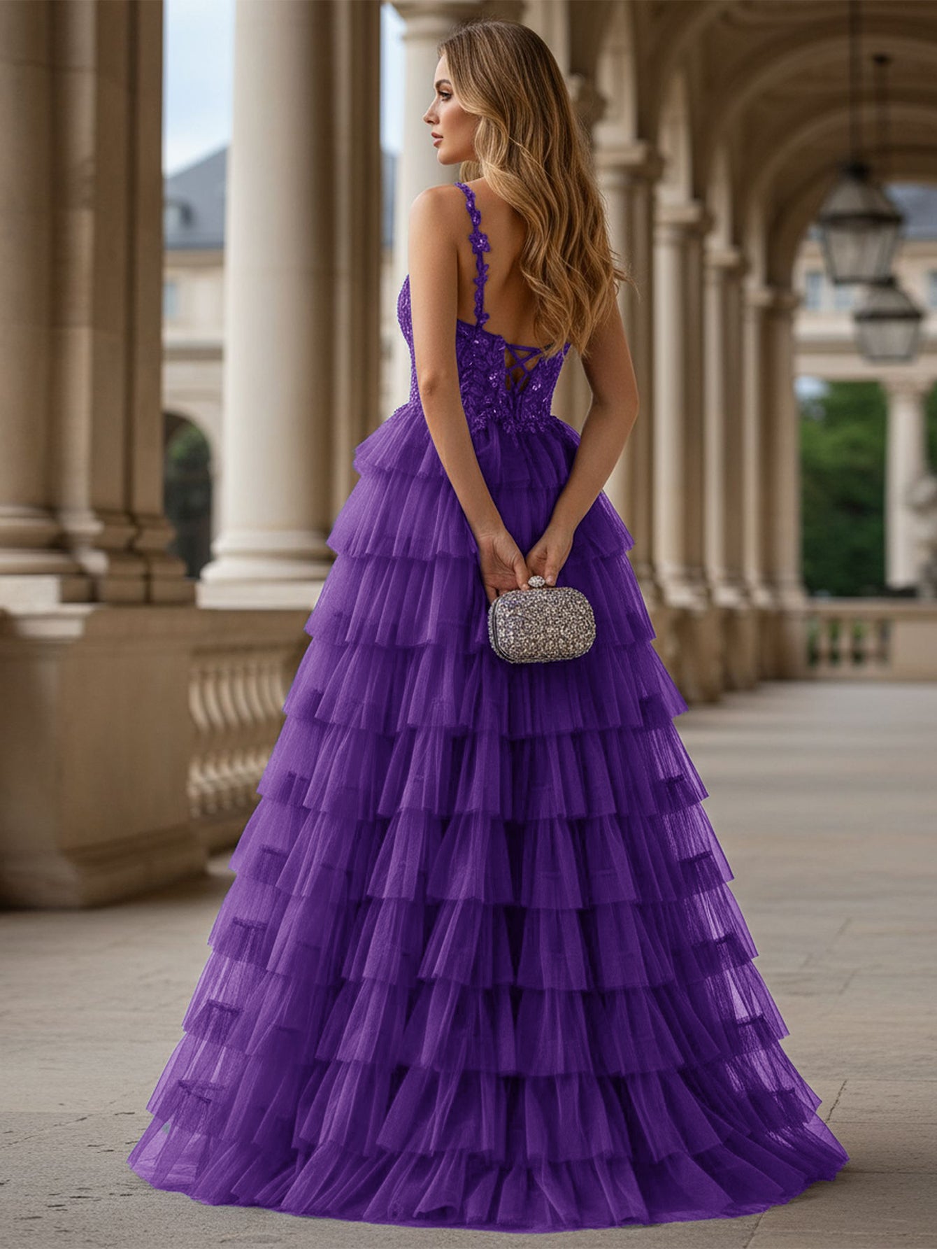 Sheer Bodice Lace Embroidery Ruffle Ball Gown Prom Dress - Purple