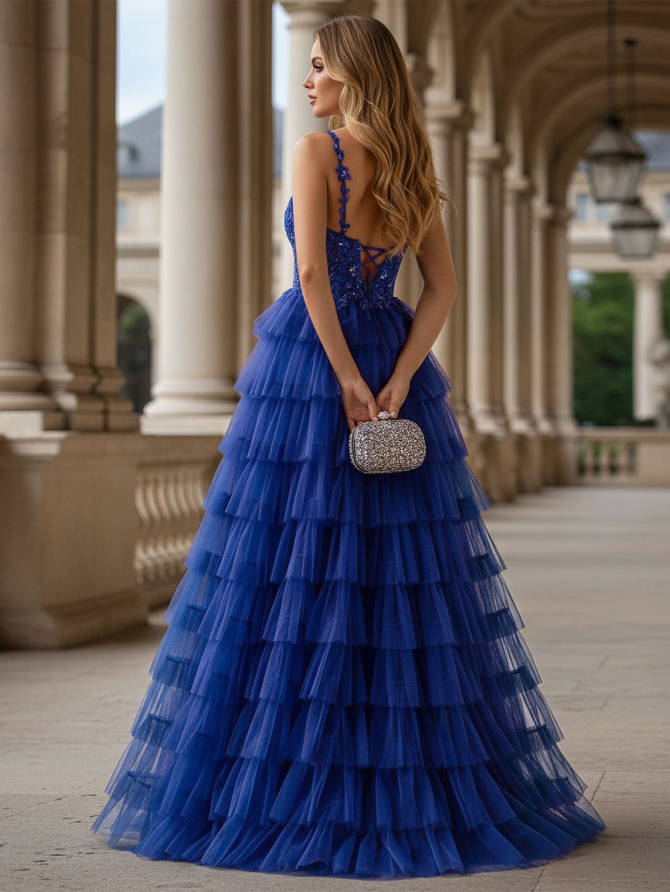 Sheer Bodice Lace Embroidery Ruffle Ball Gown Prom Dress - Royal Blue