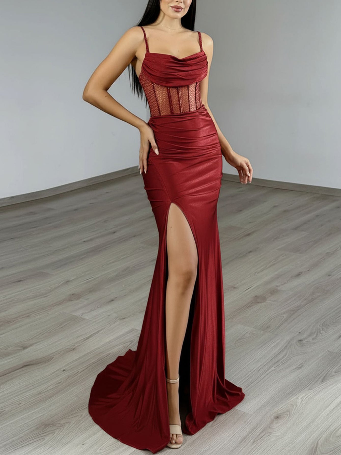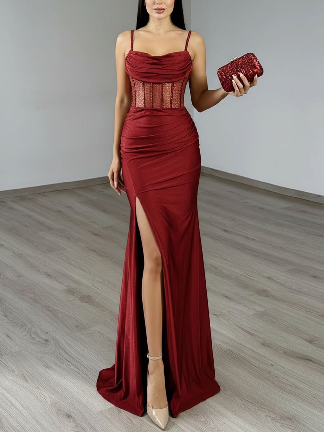 This modern prom dress features ruched bust and sheer net with crystal on the bodice. The spaghetti straps prom dress has a scoop neckline and a pleated split hem. This 2025 new sheath prom dress is ideal for party, evening or homecoming events.
