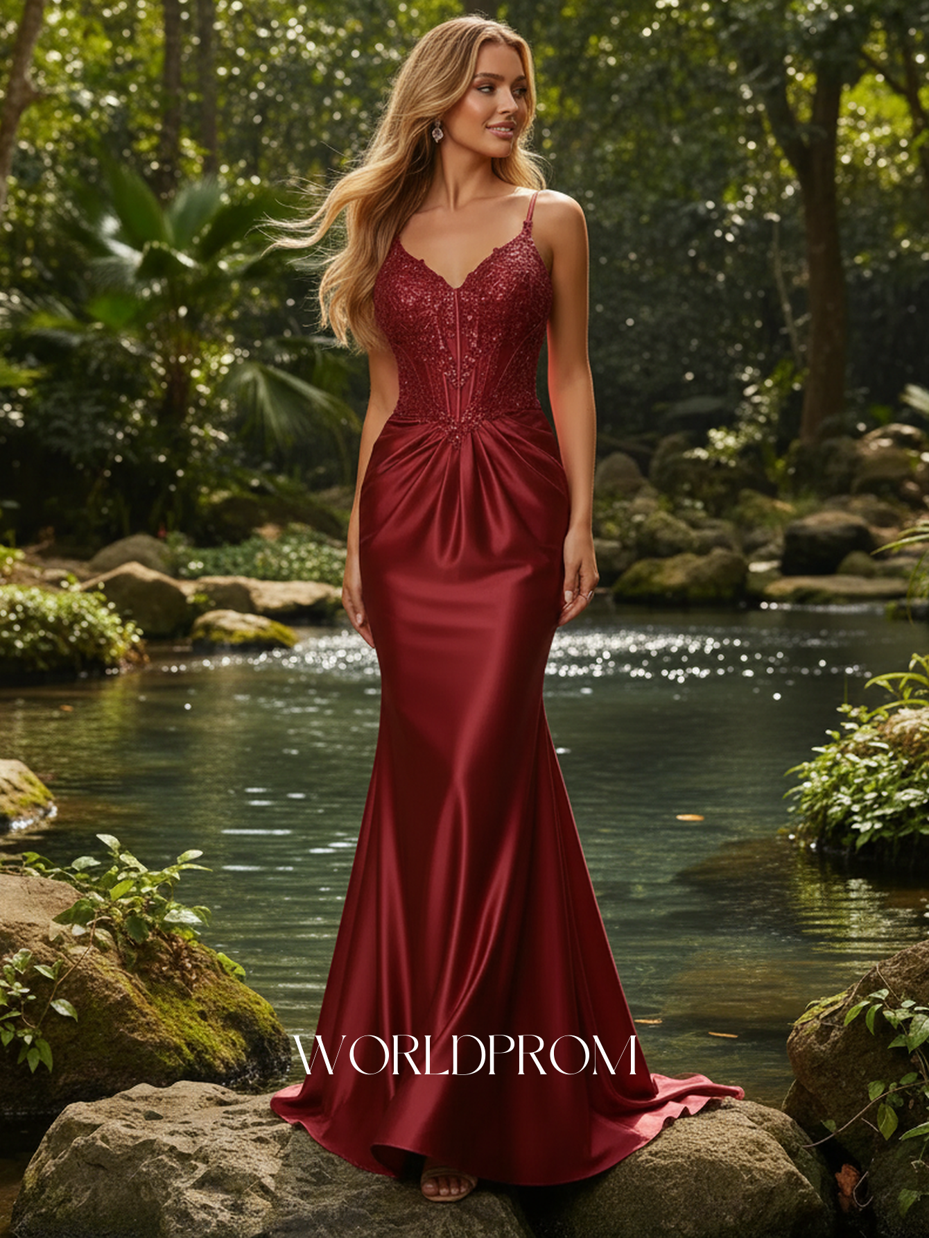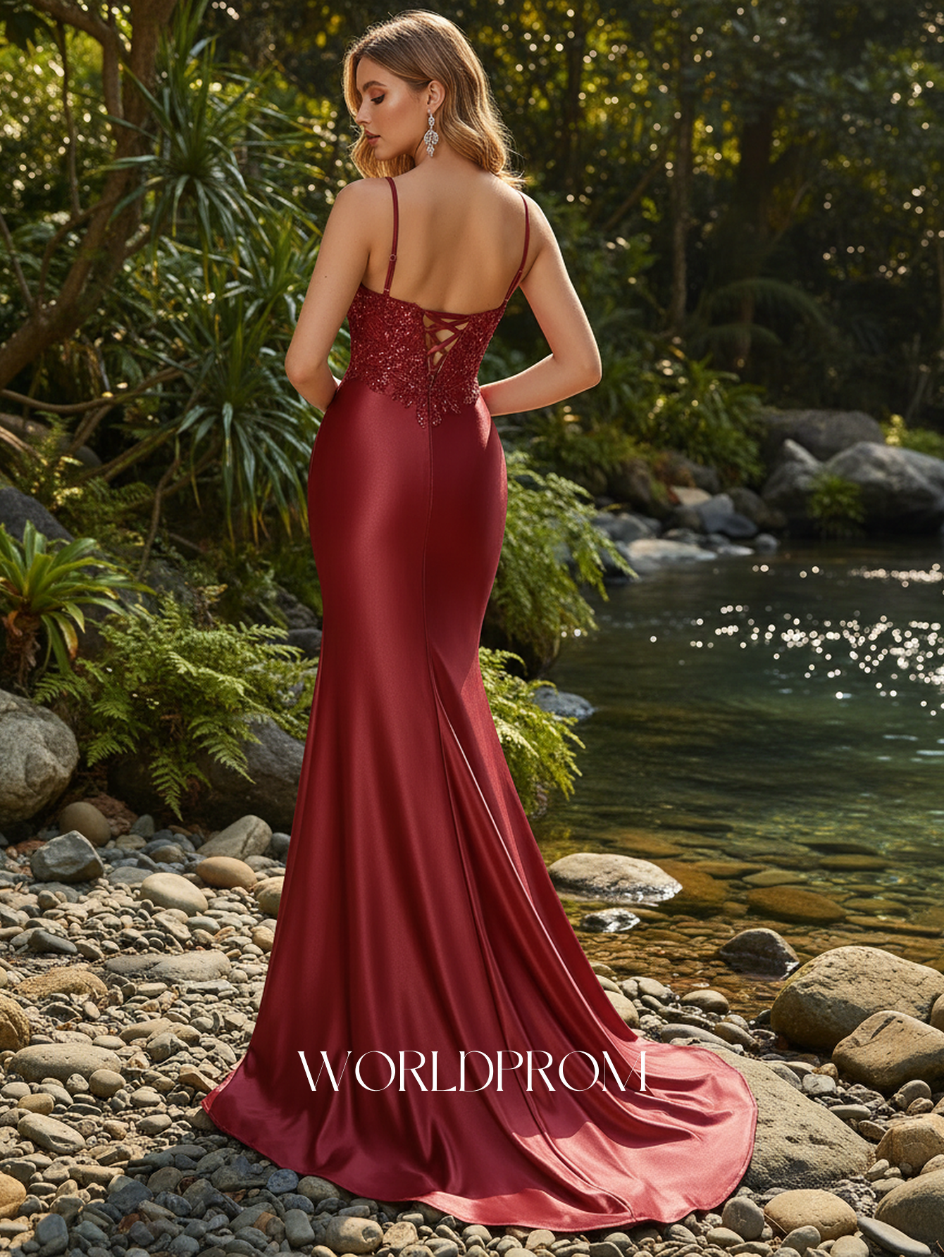 This satin prom gown features lace embroidery on the bodice. The backless maxi dress has a V-neckline and pleated hem. Mermaid formal dresses are ideal for party, evening or festivals.