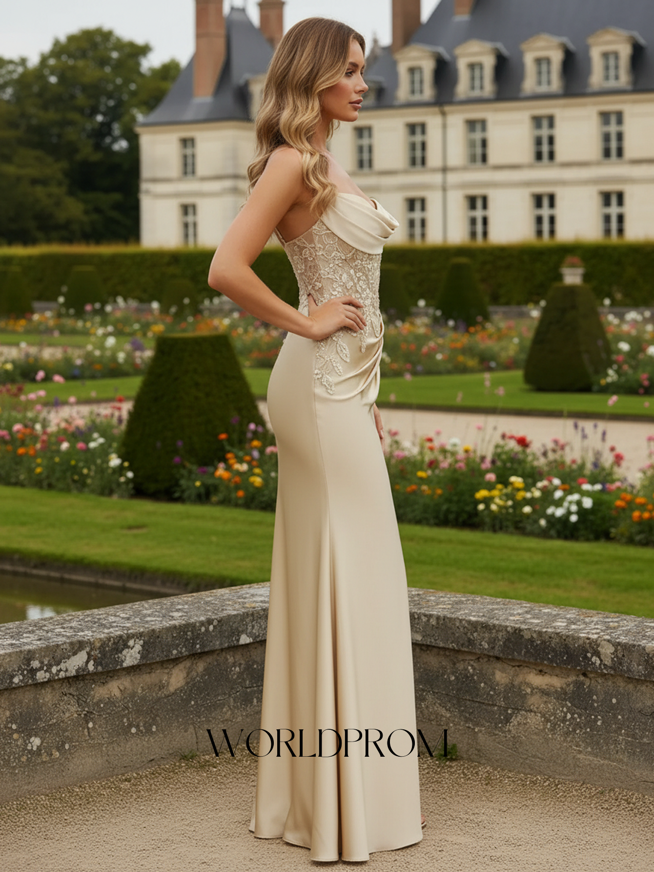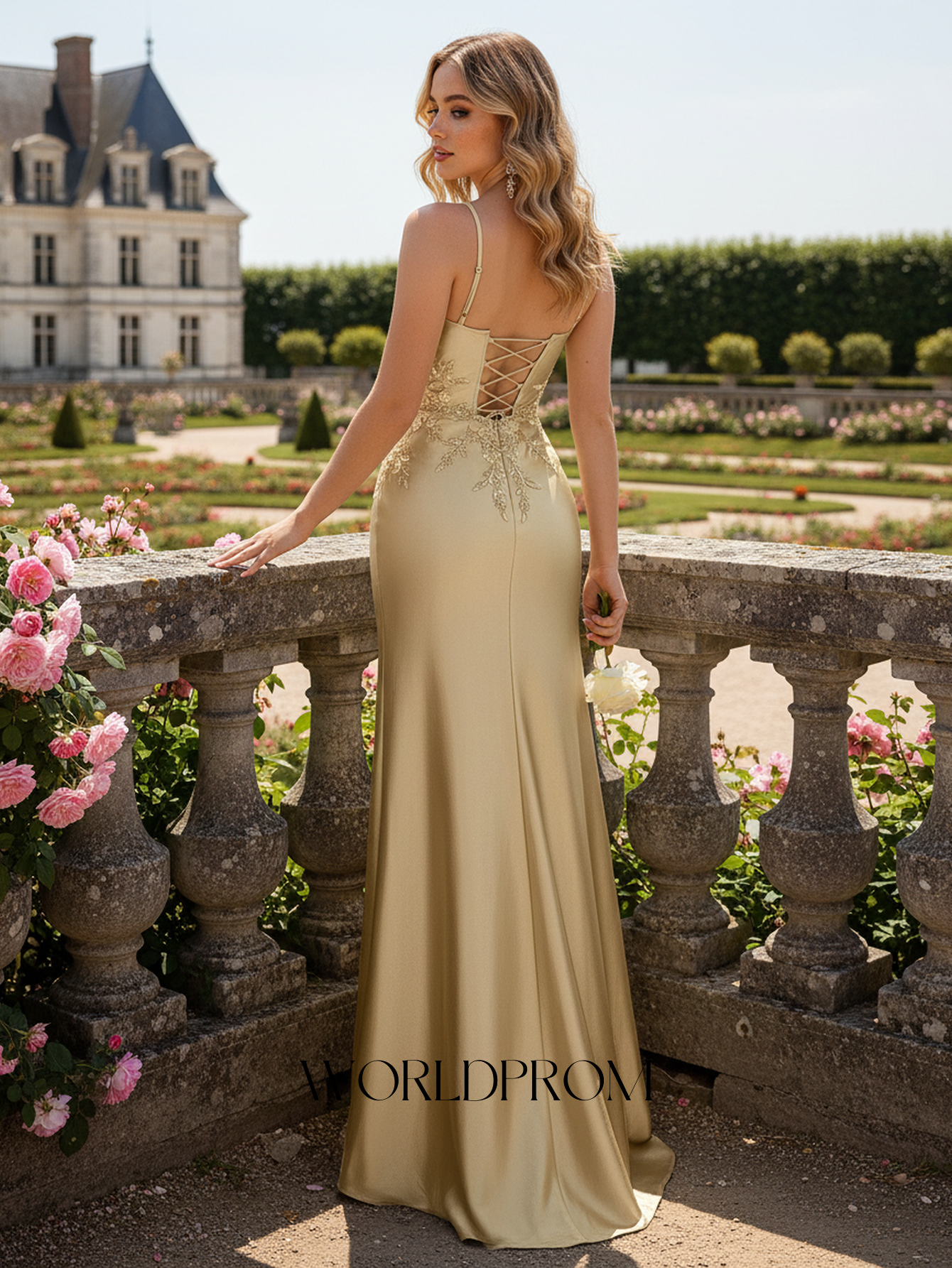 Details: Backless, Lace Up, Embroidery, Ruched Bust, Bodice