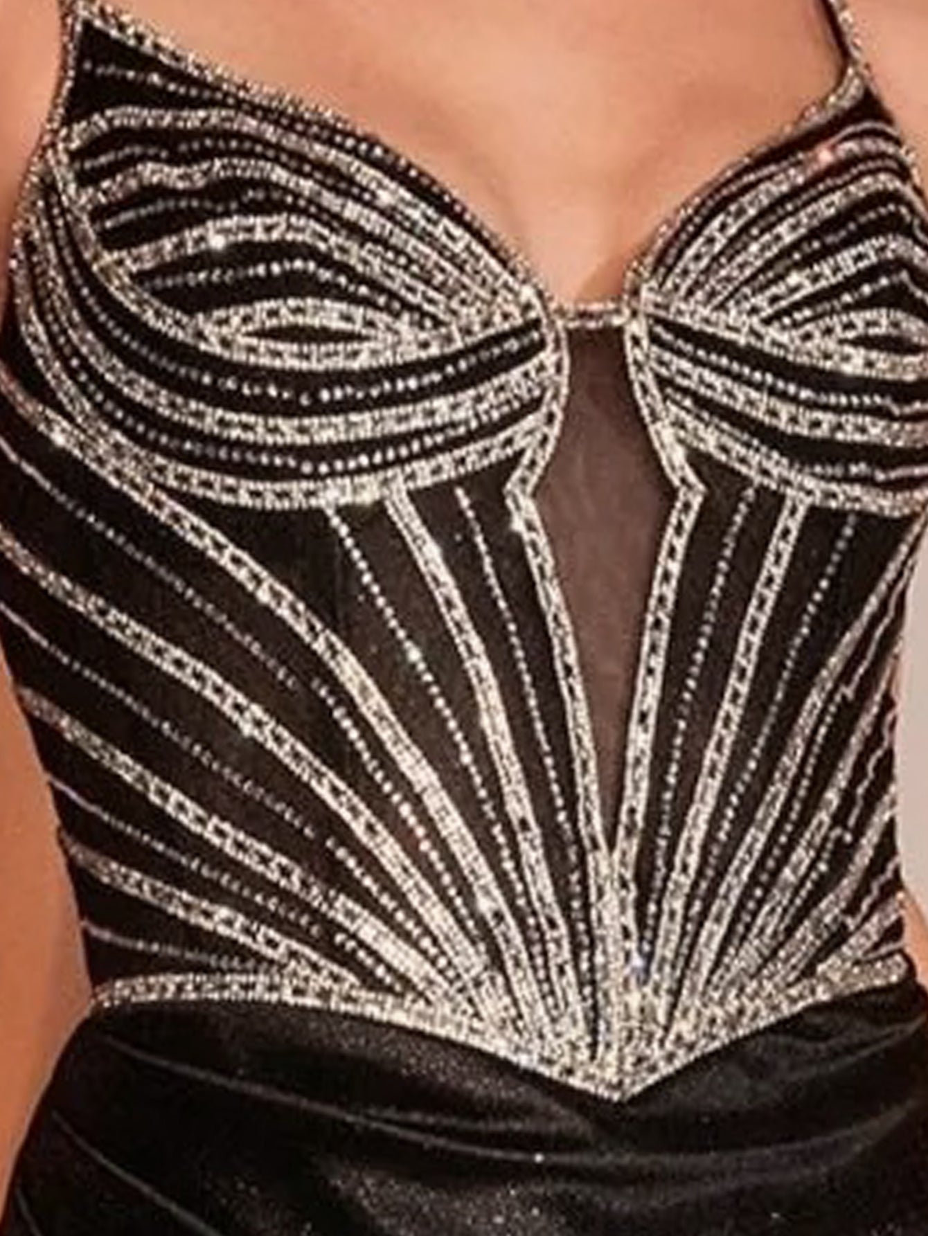 Spaghetti Strap Beading Ruched Lace Up Bodice Mermaid Prom Dress With Slit - Black