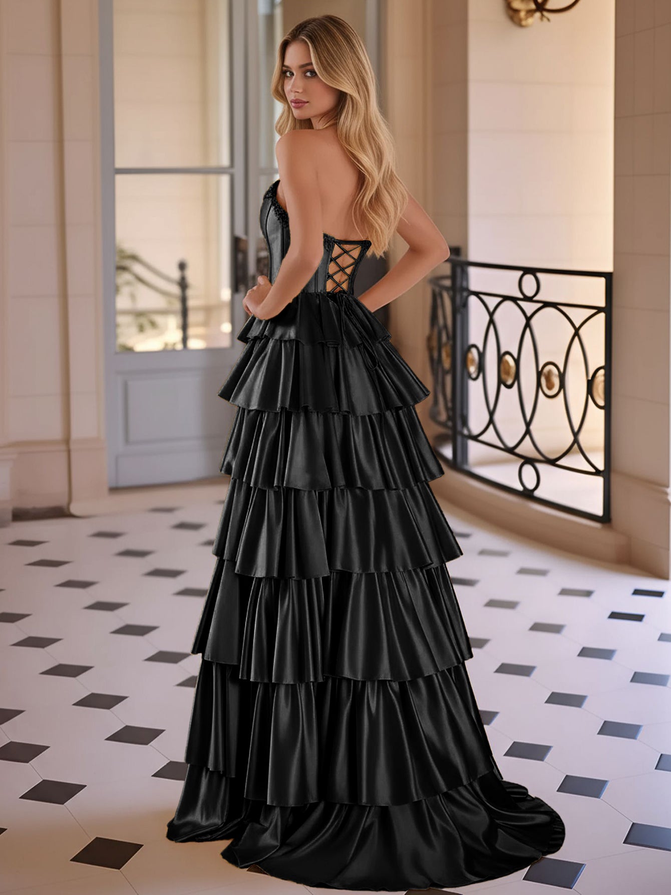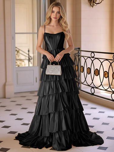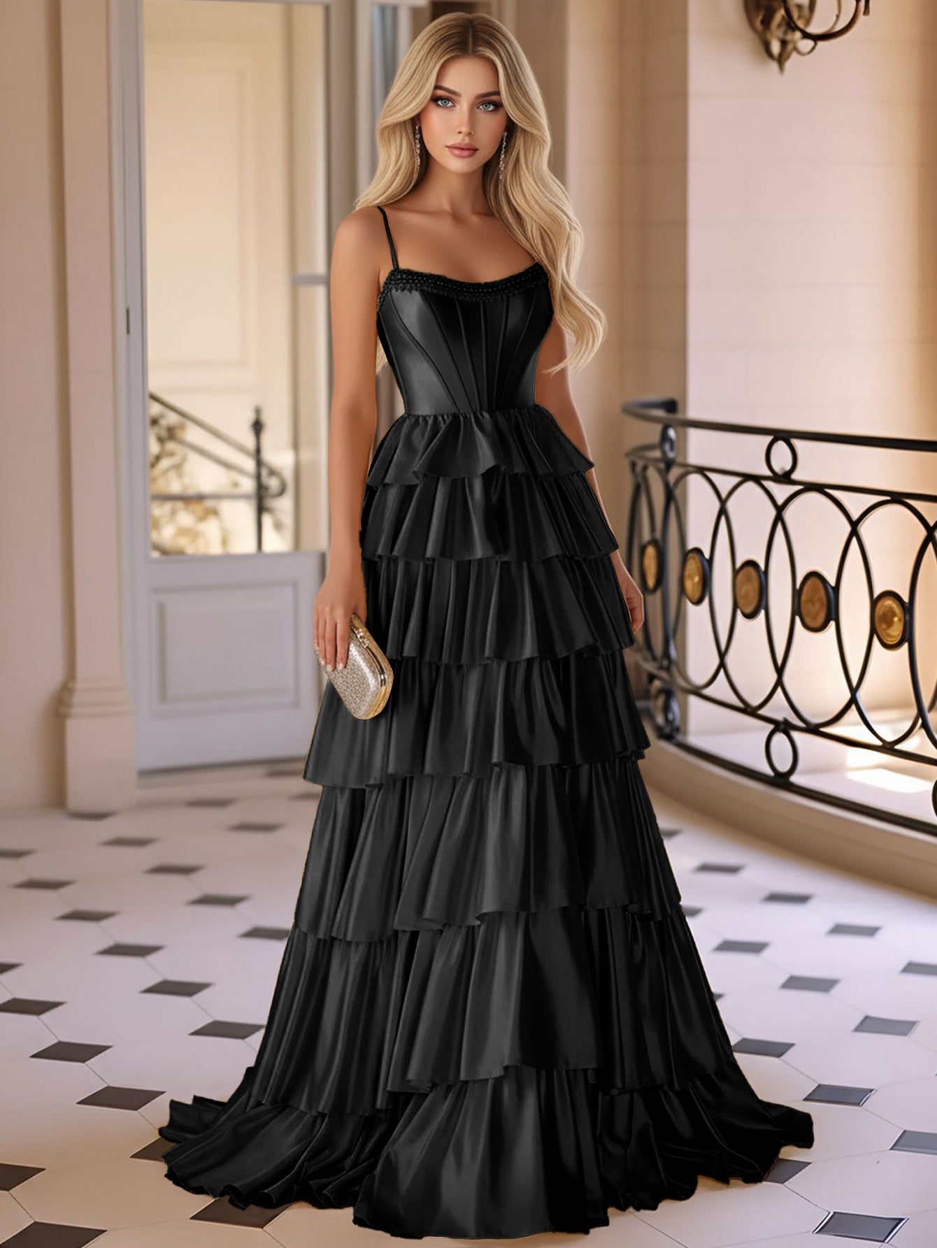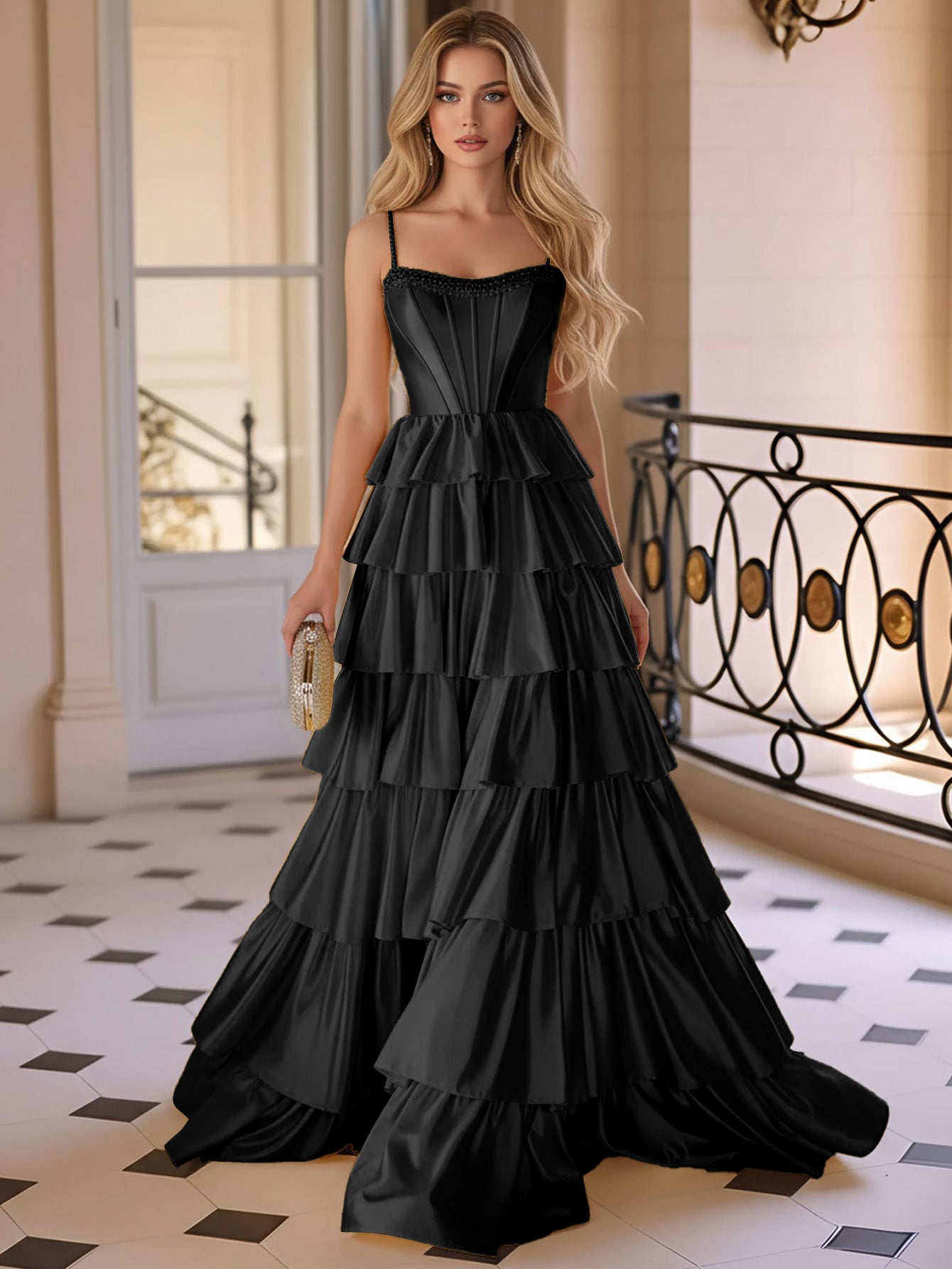 Spaghetti Strap Layered Lace Up Pleated Bodice Ball Gown Prom Dress - Black