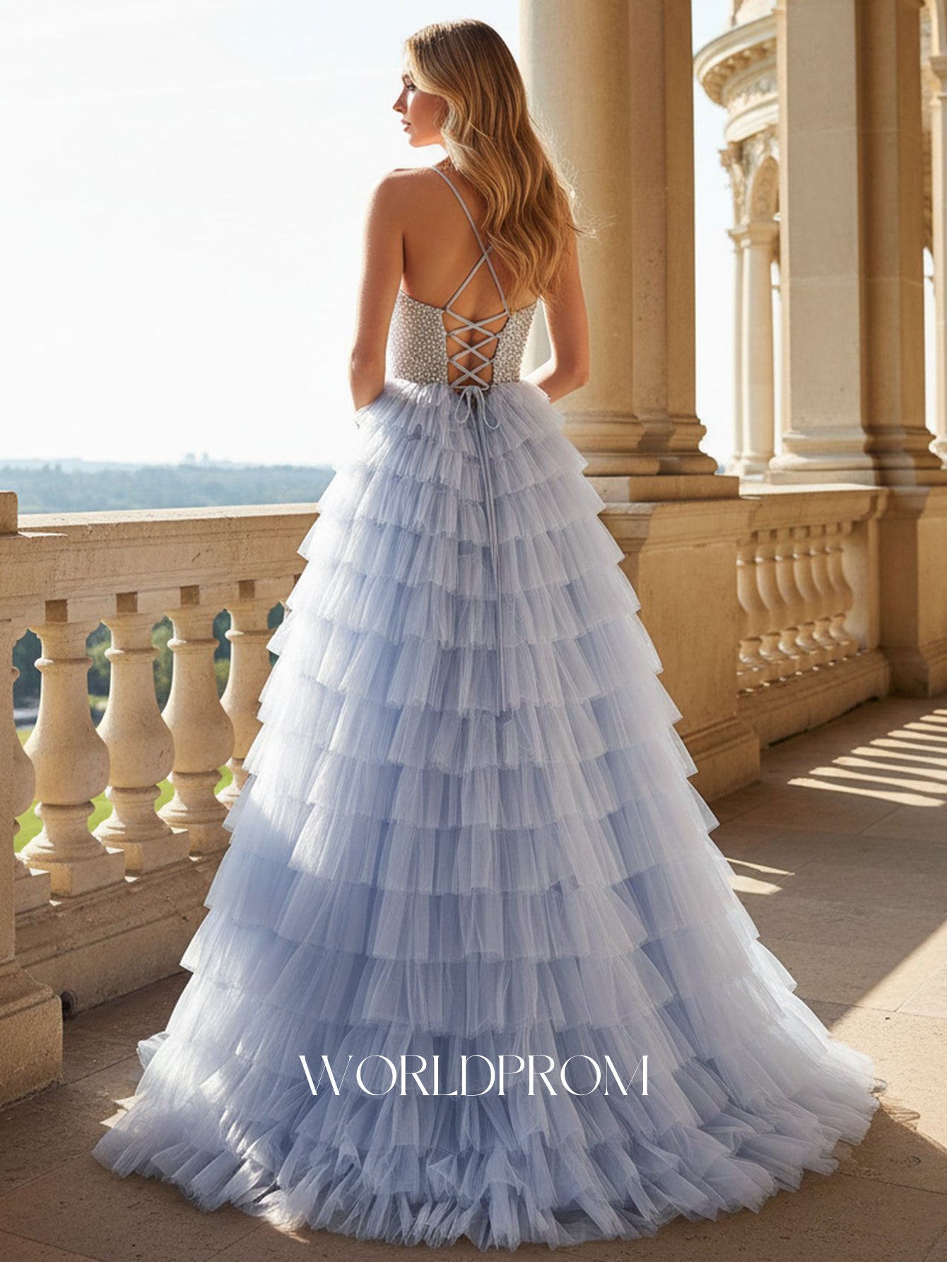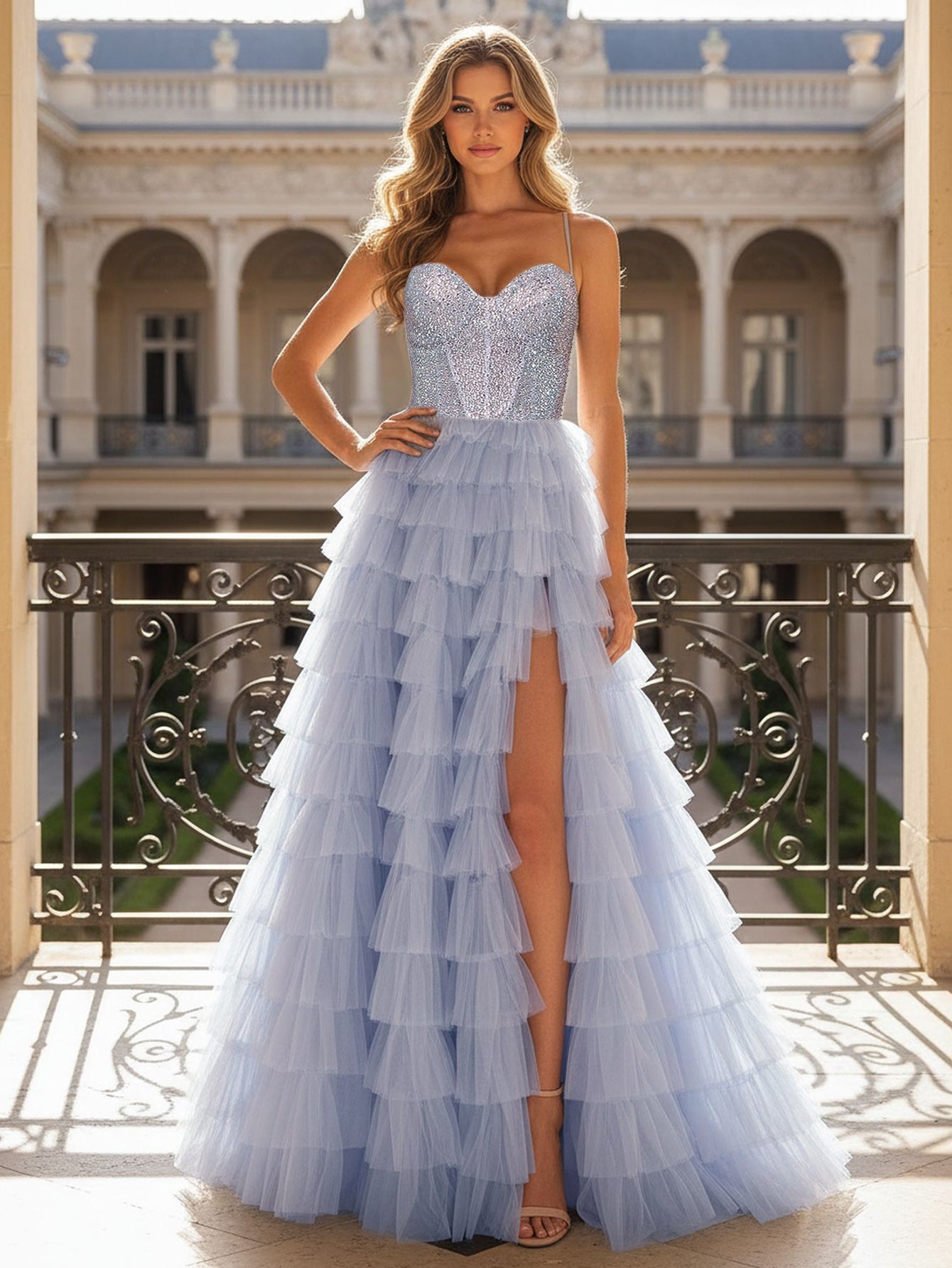 This tulle dress for prom features sequin on a sheer net bodice. The spaghetti straps prom dress has a sweetheart neck and exaggerated ruffle layered hem. The ball gown prom dress is ideal for cocktail, evening, festival or prom party.
