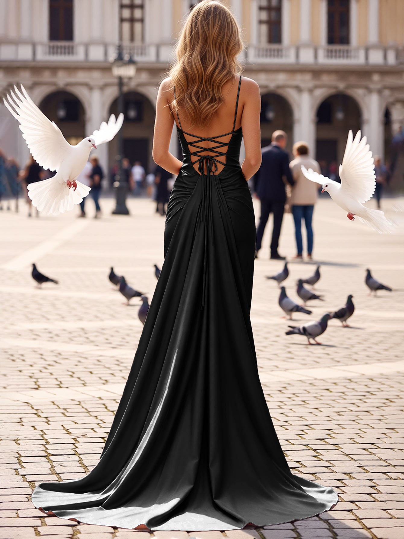 Details: Backless, Sparkly, Beading, Ruched, Lace Up, Drop Train