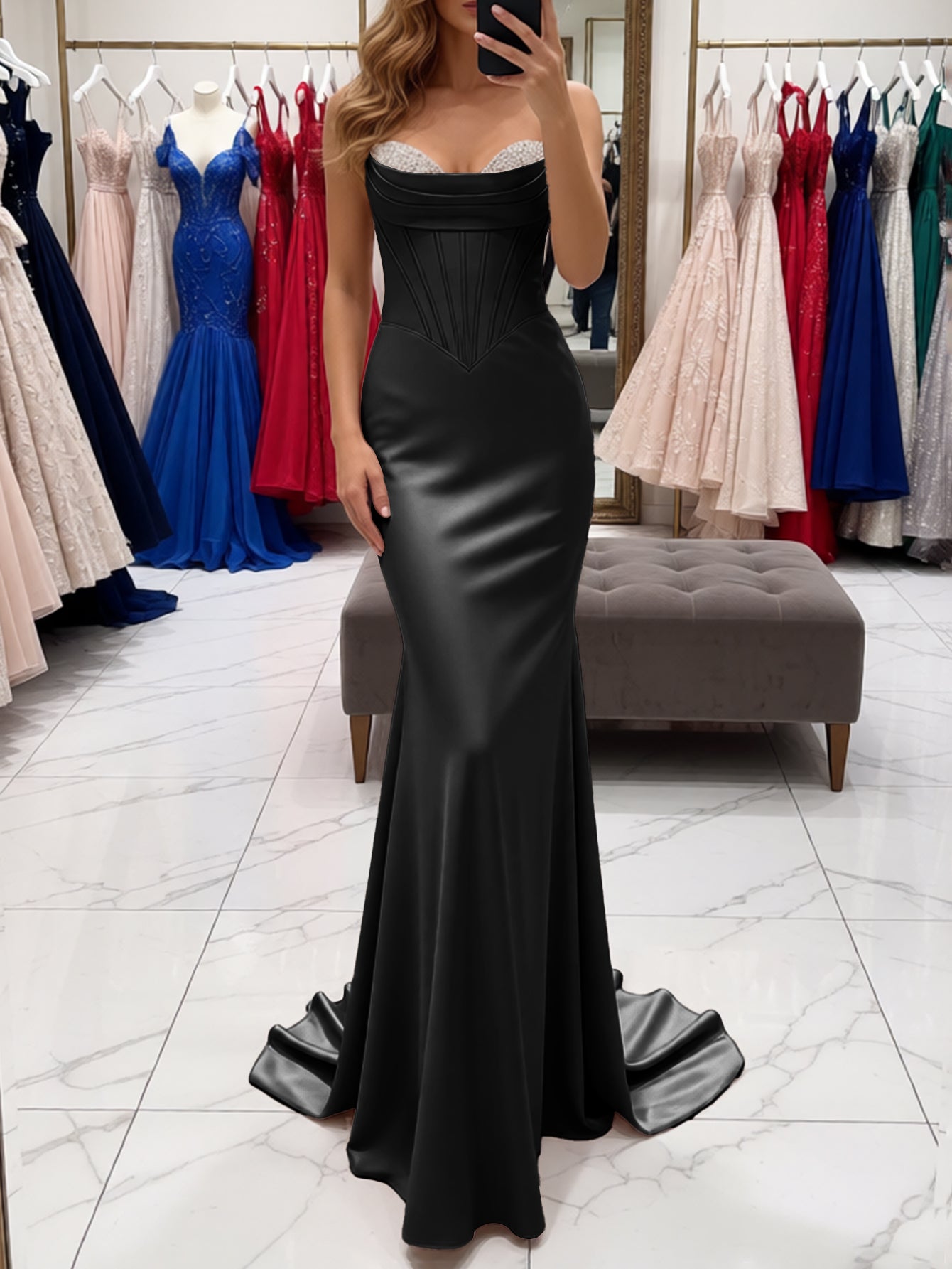 This satin prom gown features sparkly beading ruched bust on the bodice. The spaghetti straps dress has a sweetheart neckline and drop train hem. Worldprom mermaid prom dresses are ideal for party, evening or festivals.