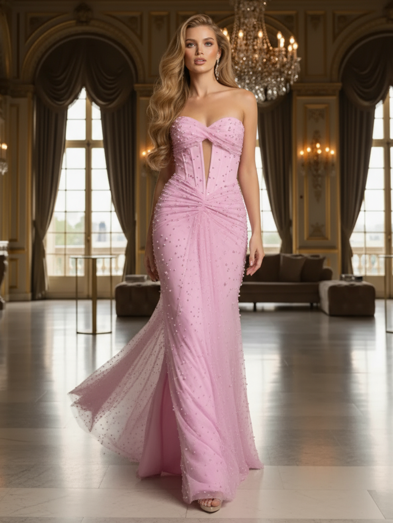 Sparkly Beading Cut Front Lace Up Ruched Mermaid Bodice Long Prom Dress - Pink