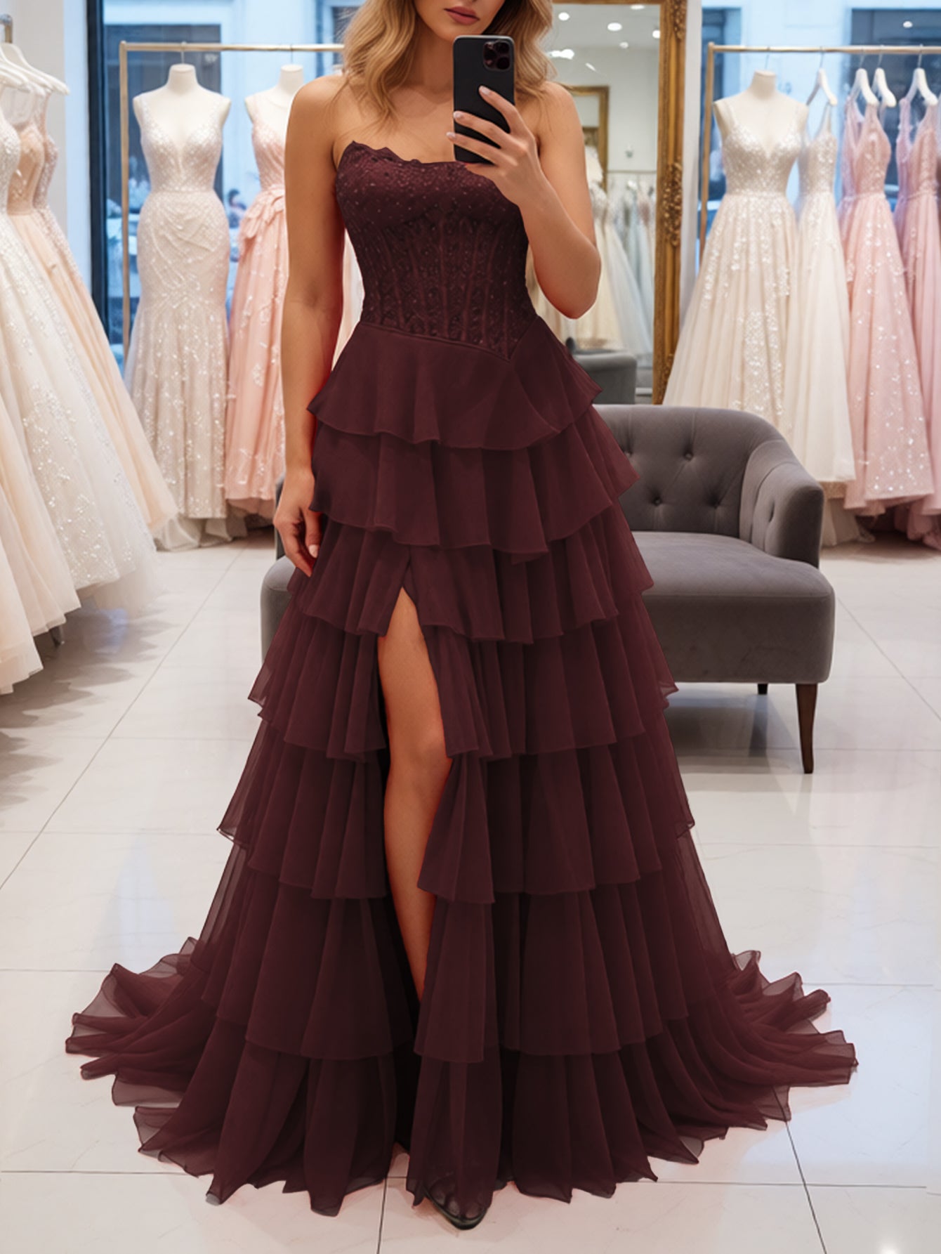 This tulle prom gown features sparkly beading with embroidery on the bodice. The strapless dress has a scoop neckline and ruffled hem. Worldprom a-line prom dresses are ideal for party, evening or festivals.