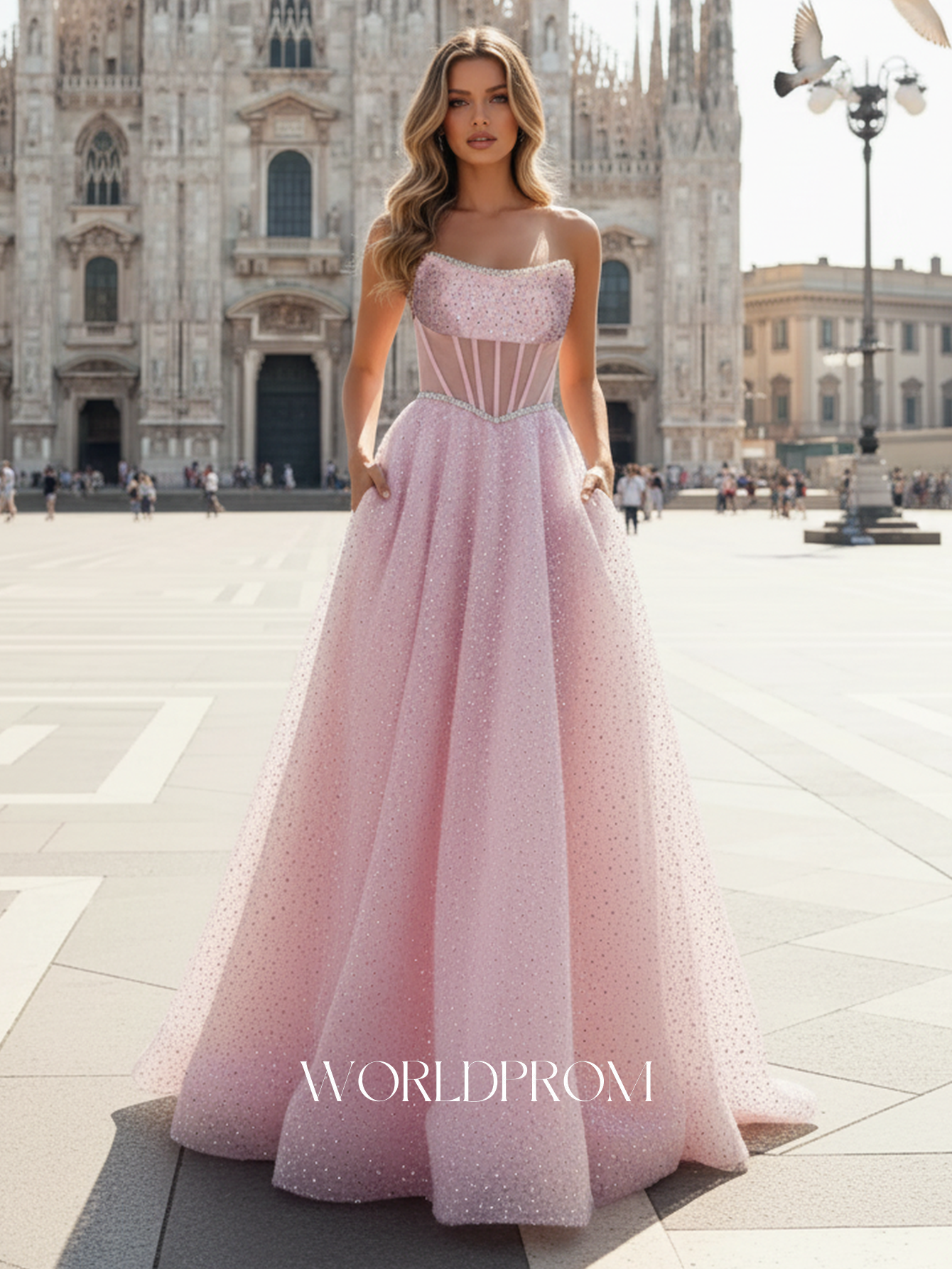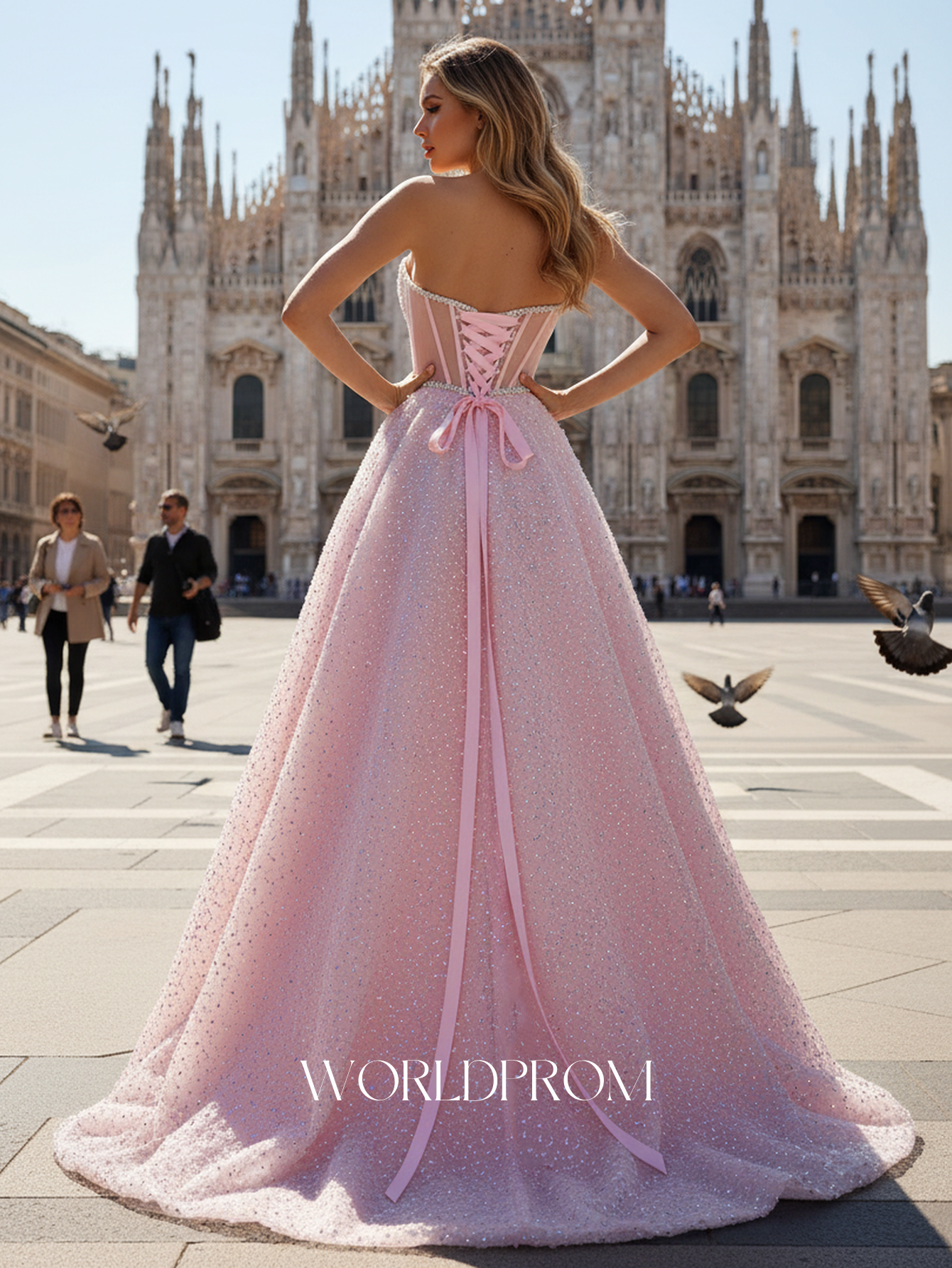 This tulle prom gown features sparkly beading with sheer on the illusion bodice. The lace up dress has a scoop Neck and pleated split hem. Worldprom a-line prom dresses are ideal for party, evening or festivals.