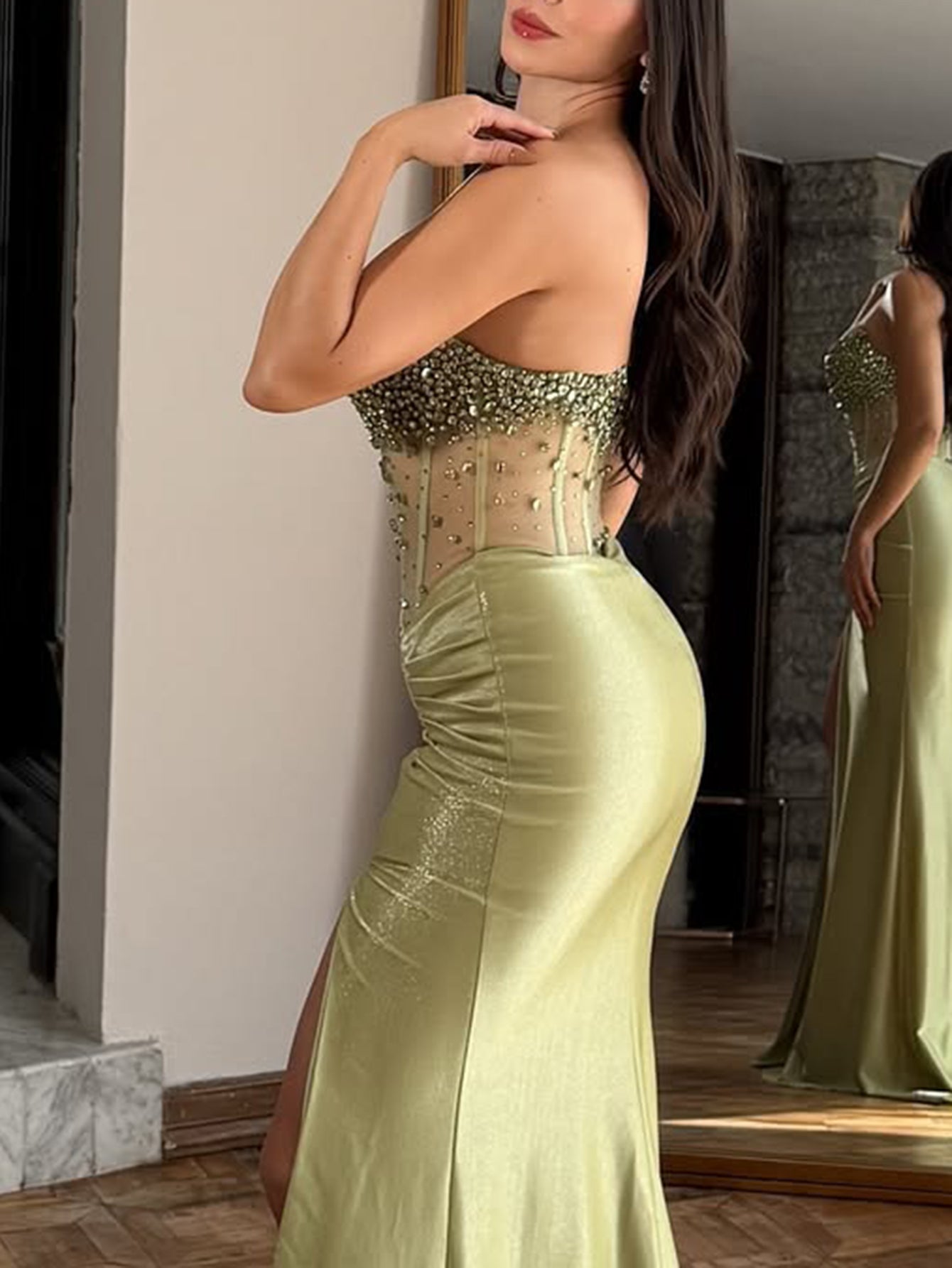 Sparkly Beading Illusion Ruched Bodice Mermaid Long Prom Dress - Sage Green