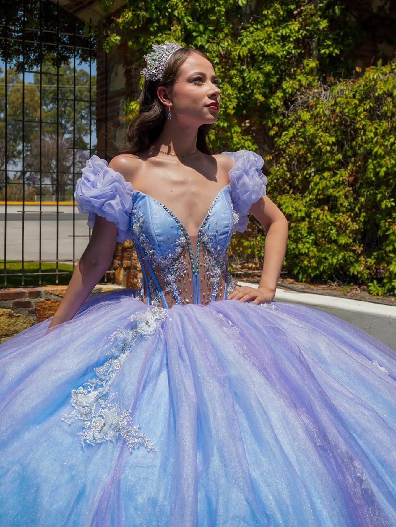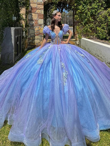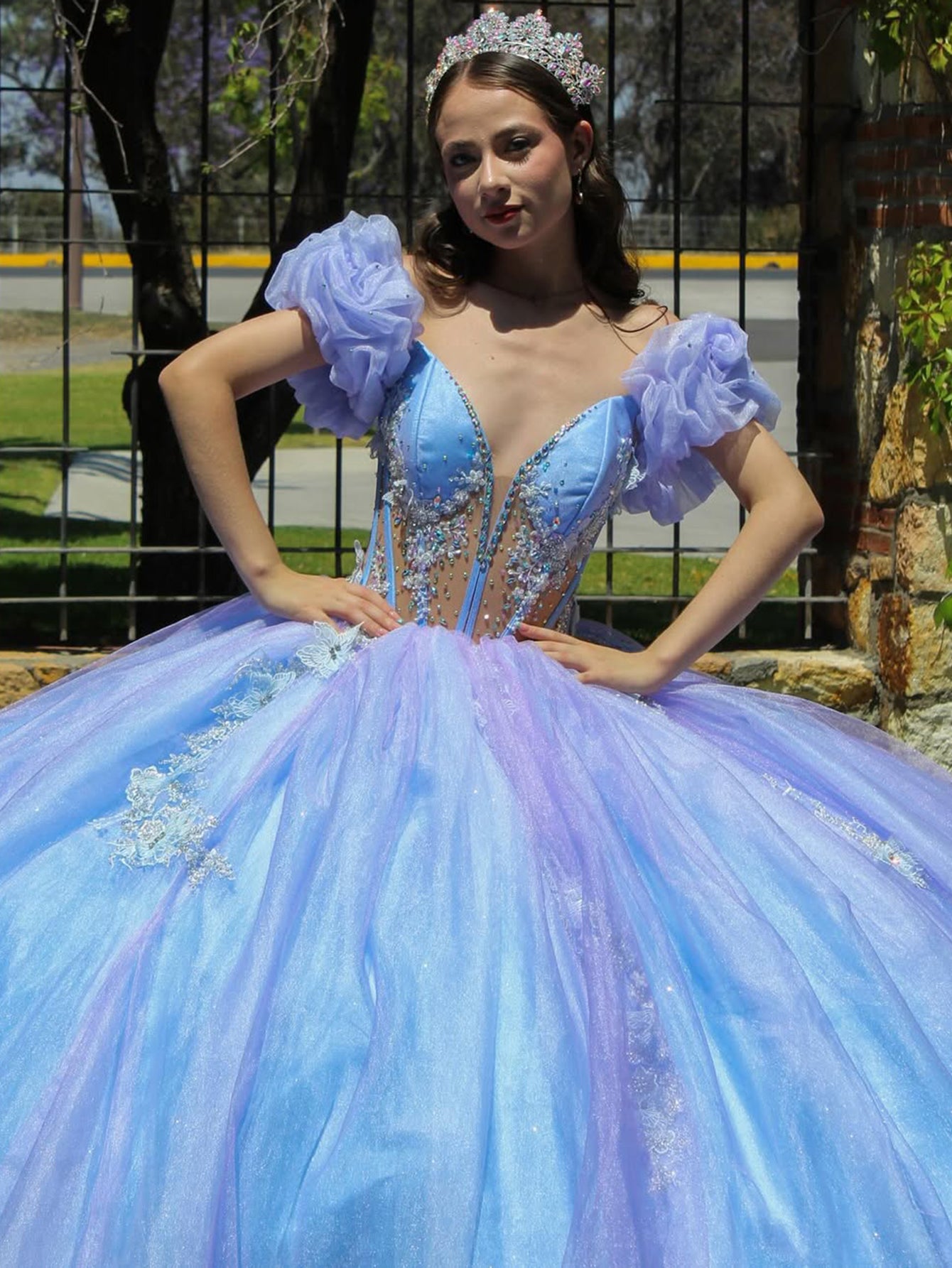 This tulle quinceanera dress features sparkly beading with flounce sleeves on the bodice. The off shoulder princess dress has a deep V-neck and ball gown hem. Worldprom sparkly hoop dresses are ideal for graduation, festival, anniversary party, birthday party, or wedding guest party.