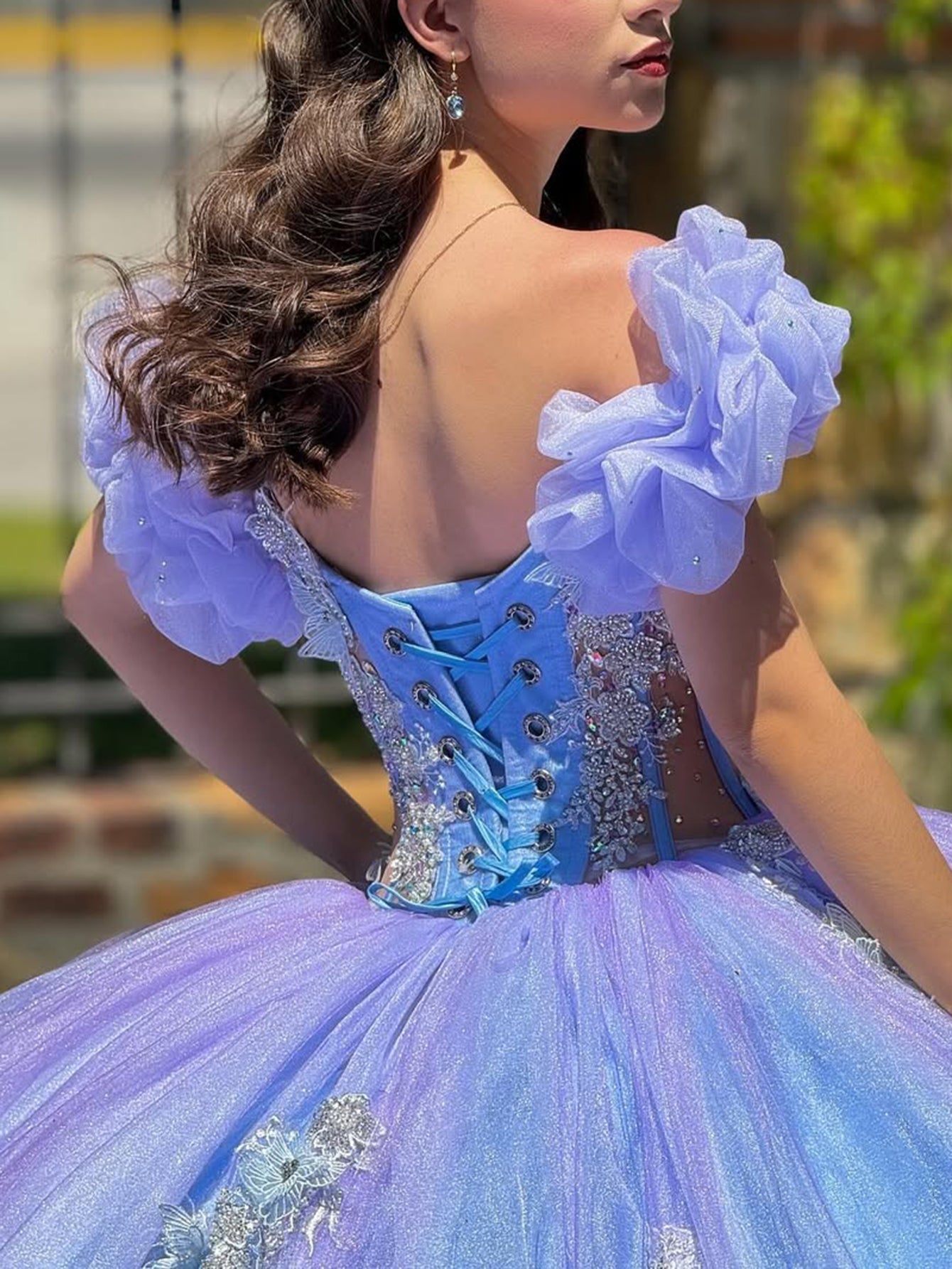 Sparkly Beading Lace Up Bodice Ball Gown Long Quinceanera Dress With Flounce Sleeves - Lavender