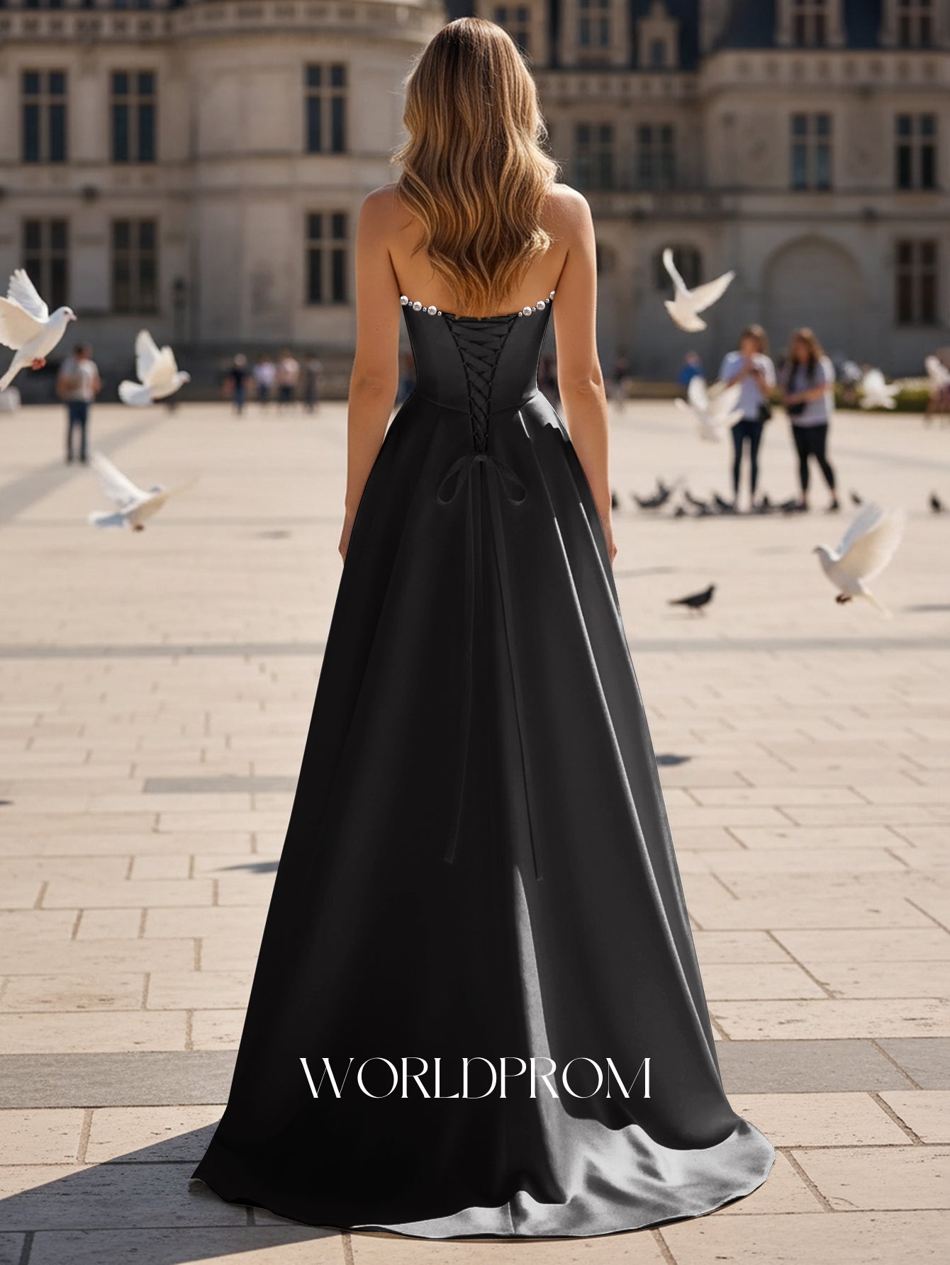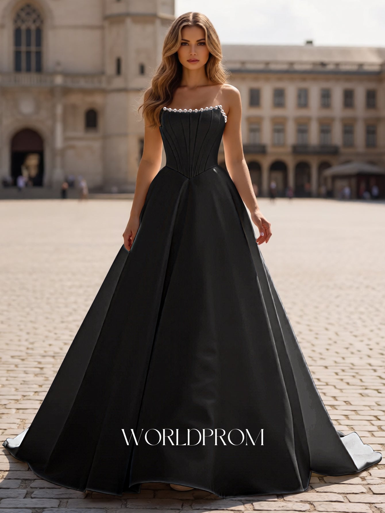 This satin prom gown features sparkly beading on the bodice. The strapless maxi dress has a scoop neckline and pleated hem. Worldprom ball gown prom dresses are ideal for party, evening or festivals.