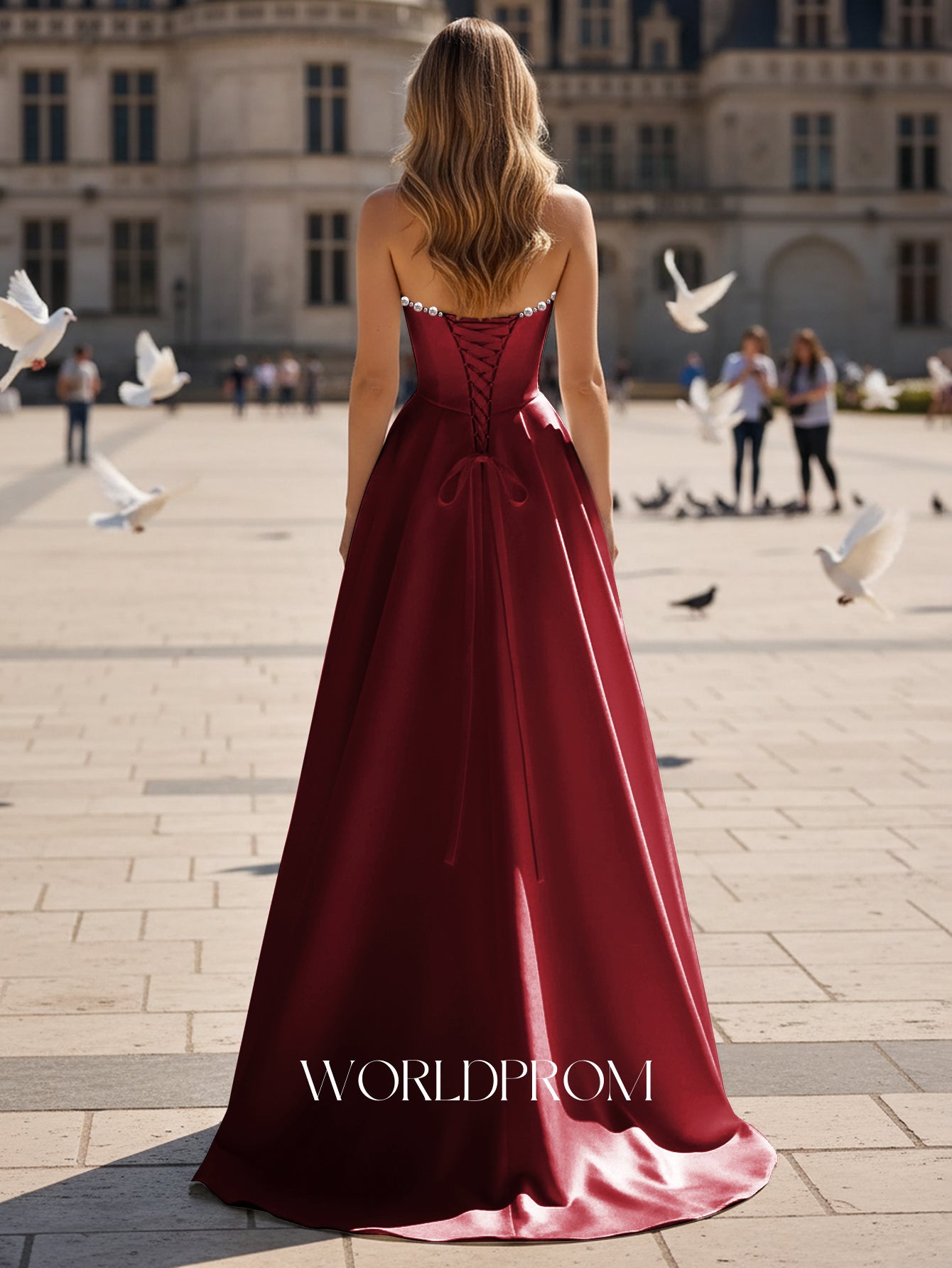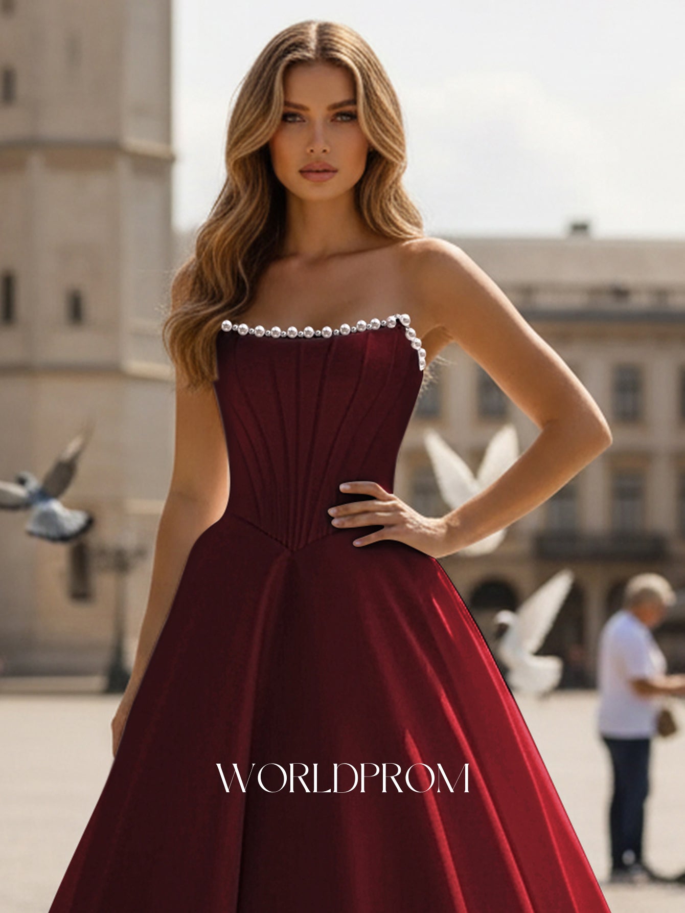 This satin prom gown features sparkly beading on the bodice. The strapless maxi dress has a scoop neckline and pleated hem. Worldprom ball gown prom dresses are ideal for party, evening or festivals.