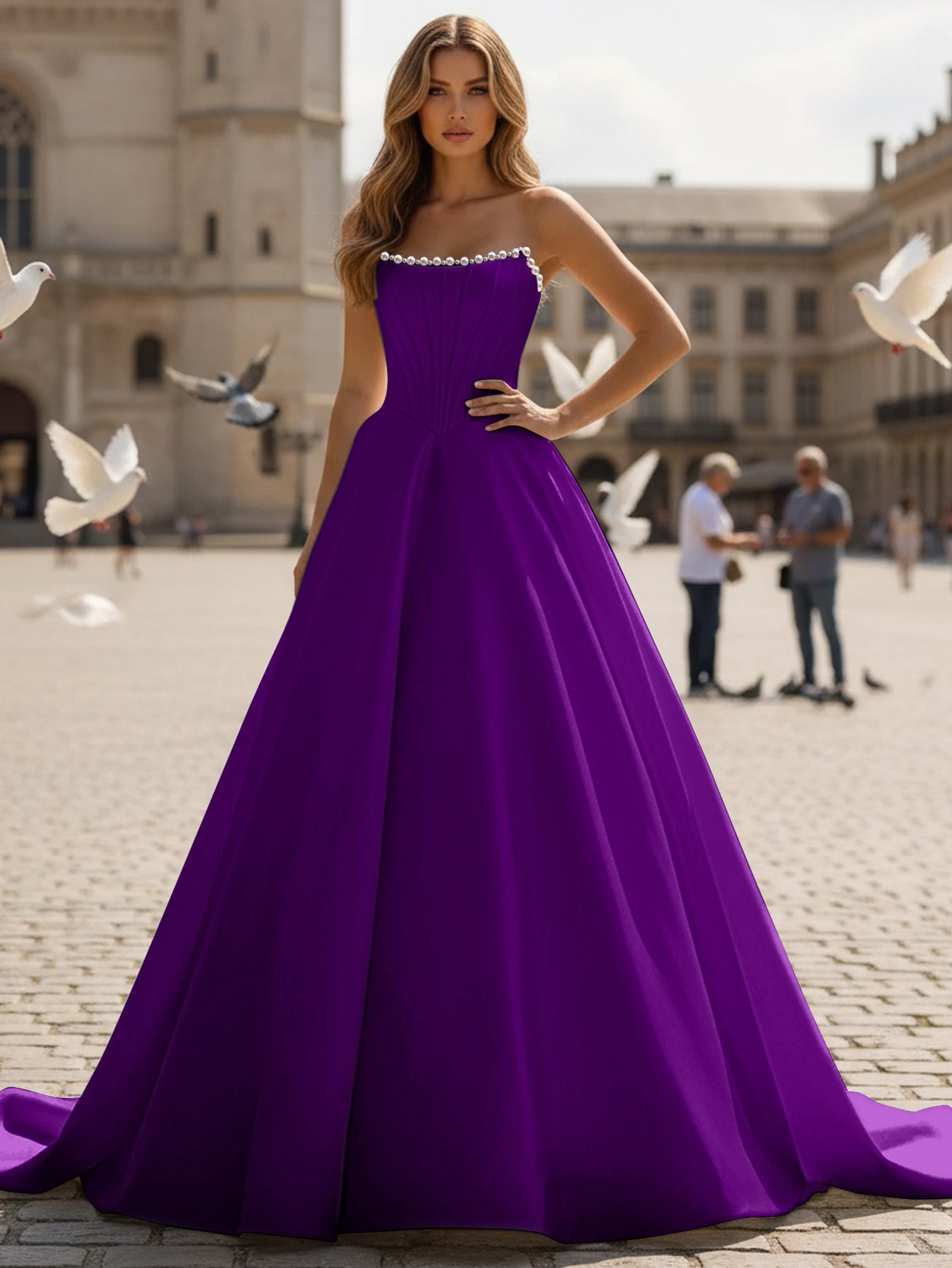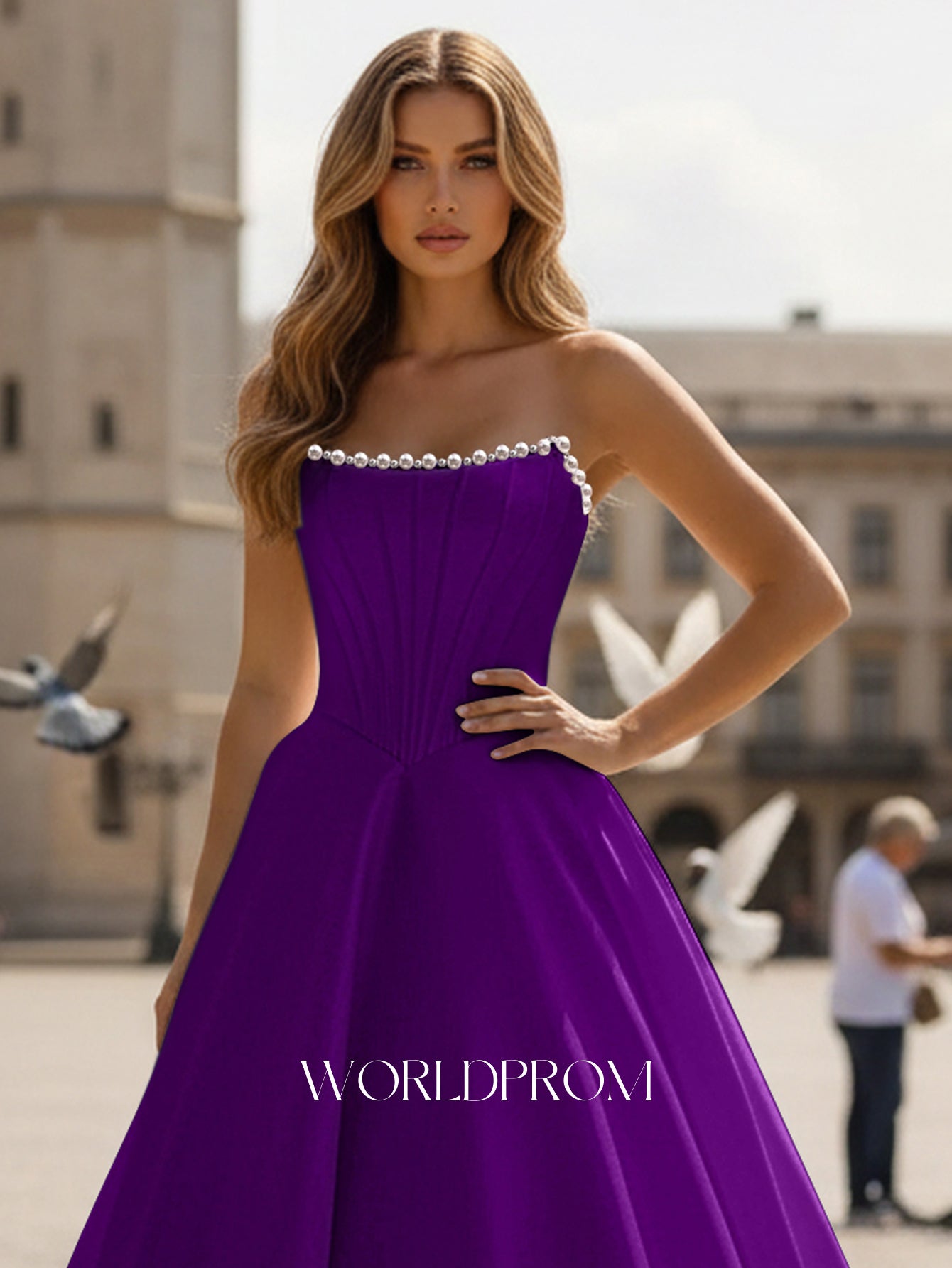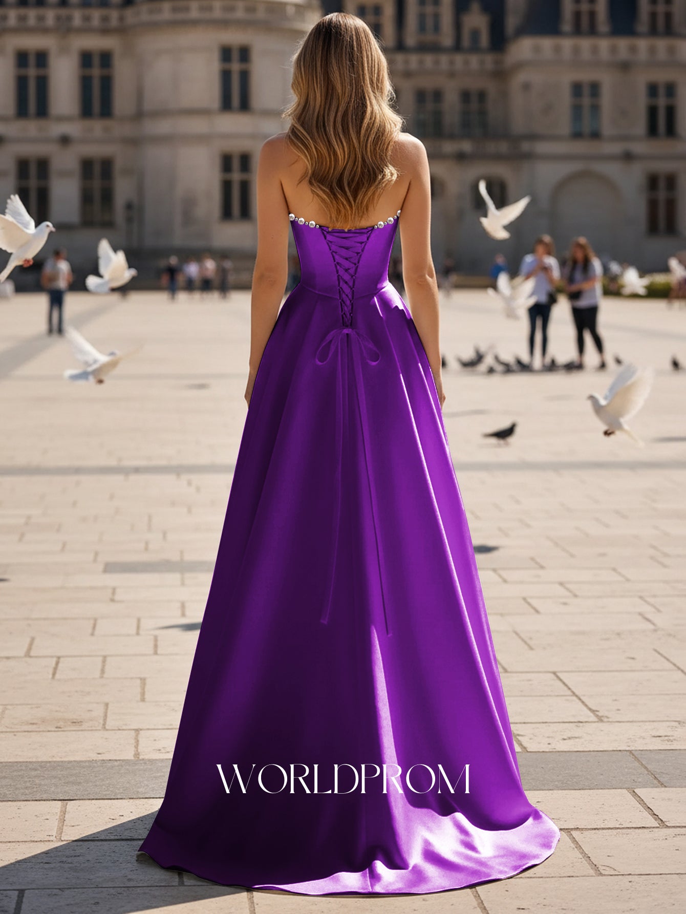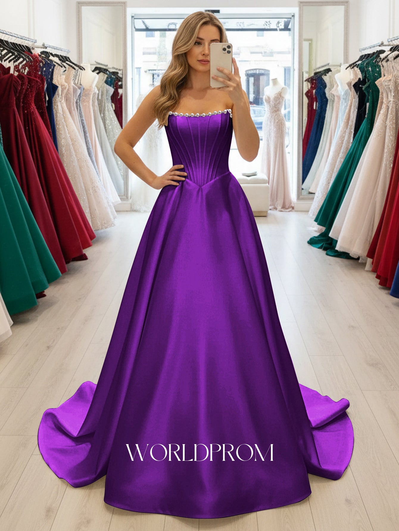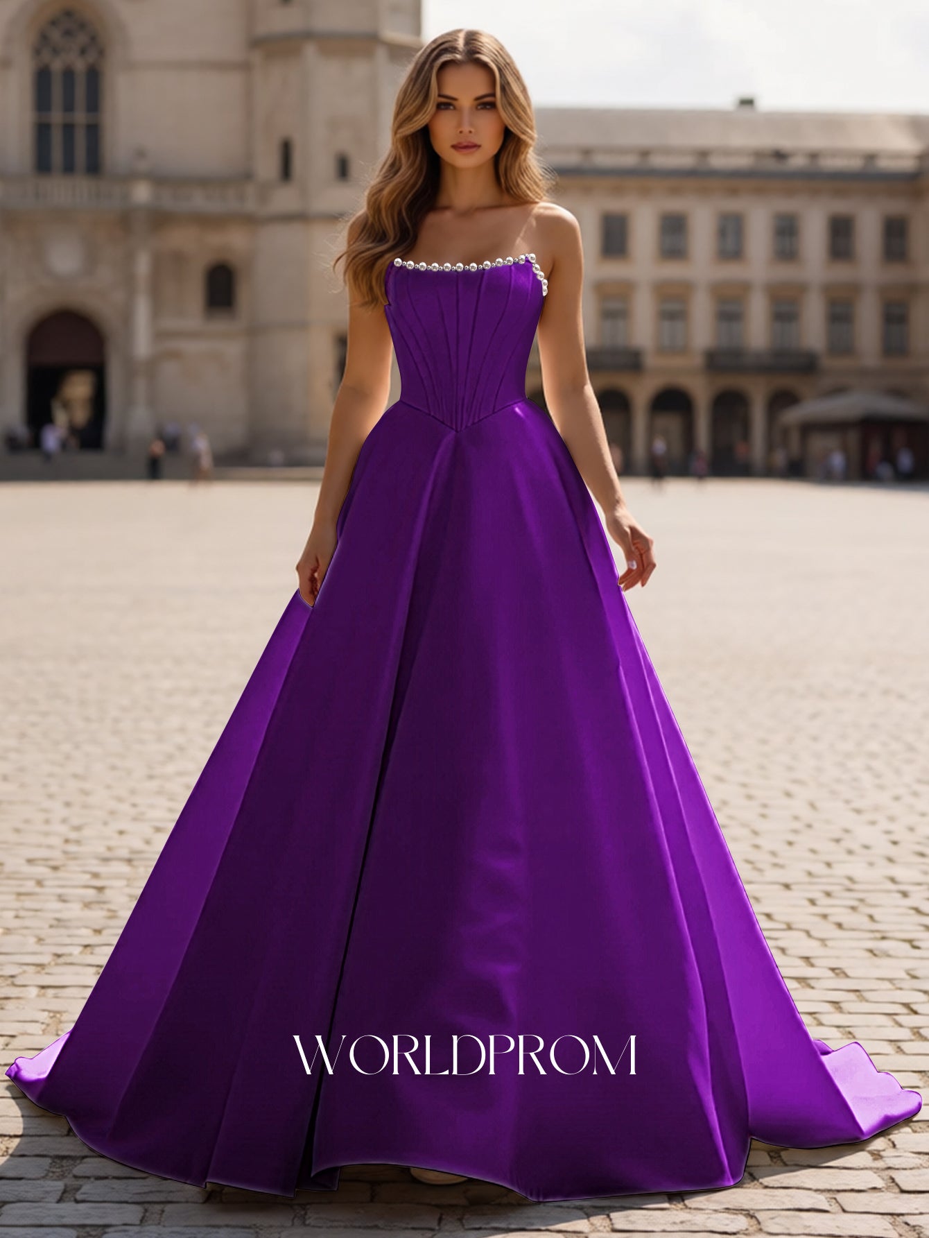 This satin prom gown features sparkly beading on the bodice. The strapless maxi dress has a scoop neckline and pleated hem. Worldprom ball gown prom dresses are ideal for party, evening or festivals.