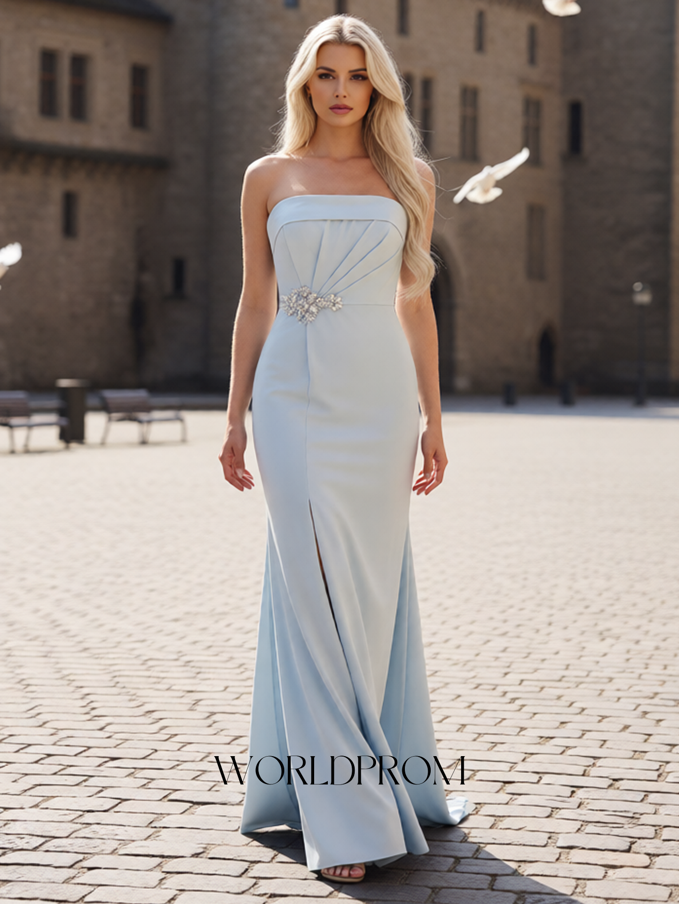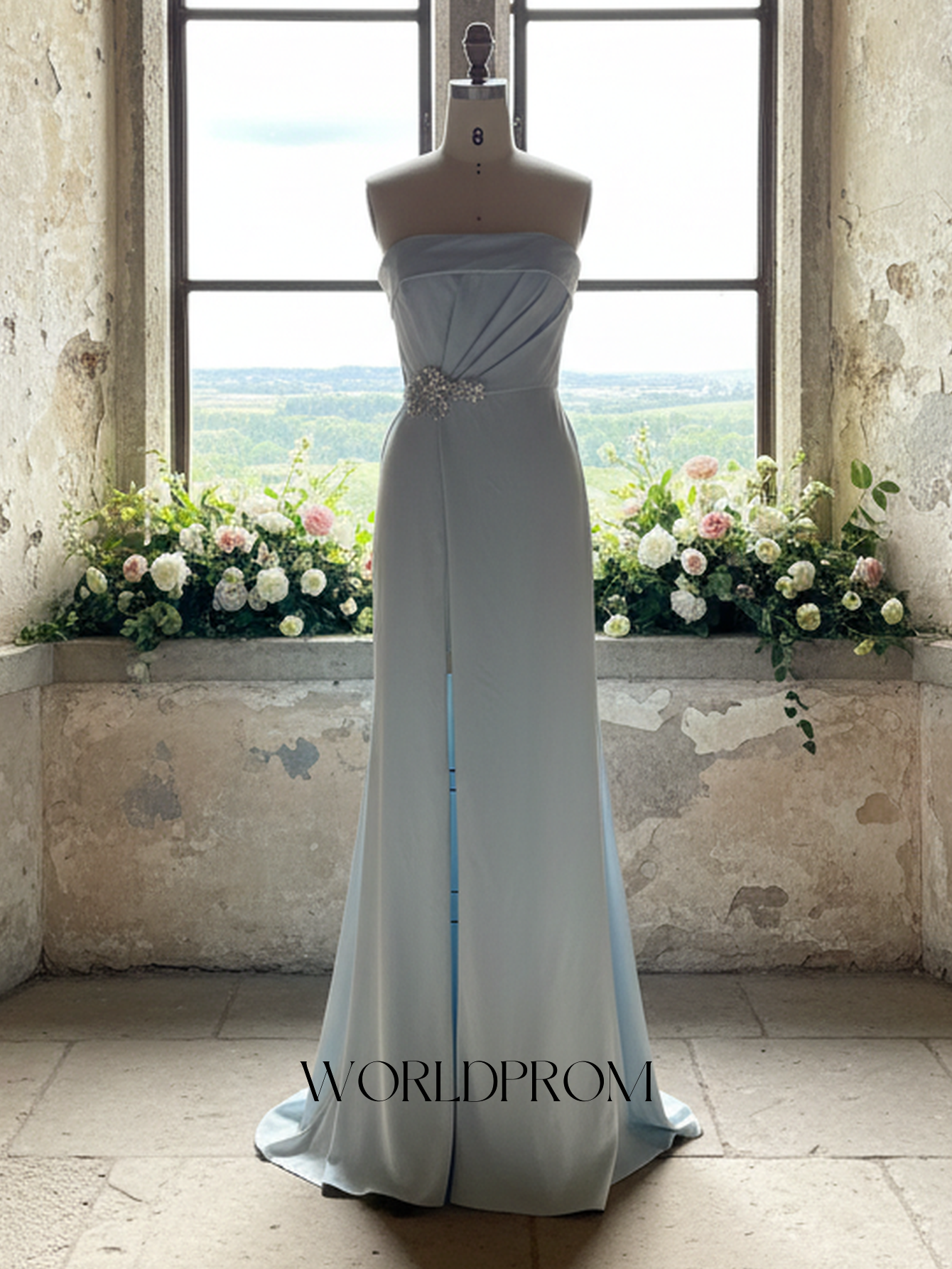 This satin prom gown features sparkly beading bust on the bodice. The strapless dress has a scoop neckline and split hem. Worldprom mermaid prom dresses are ideal for party, evening or festivals.