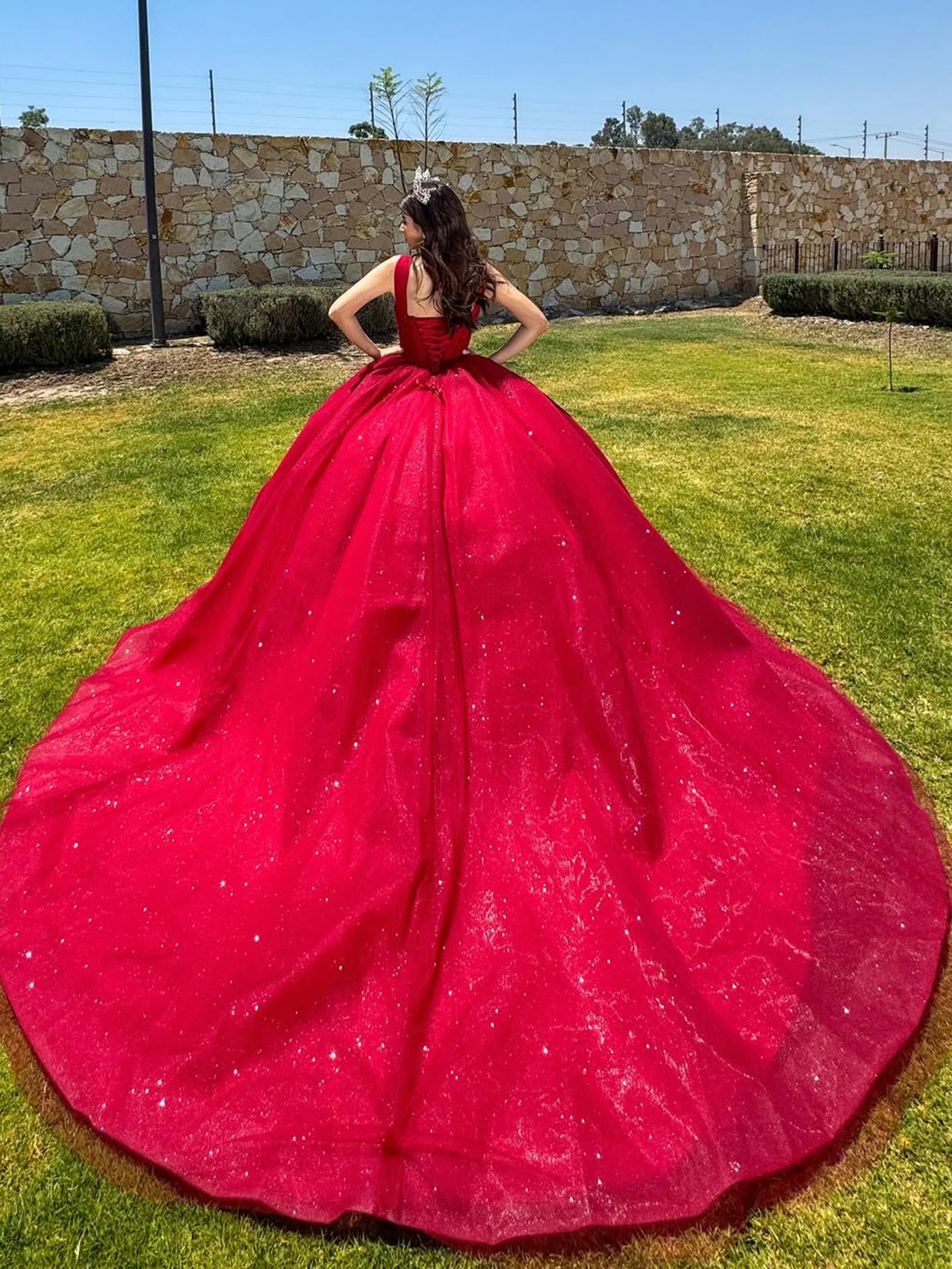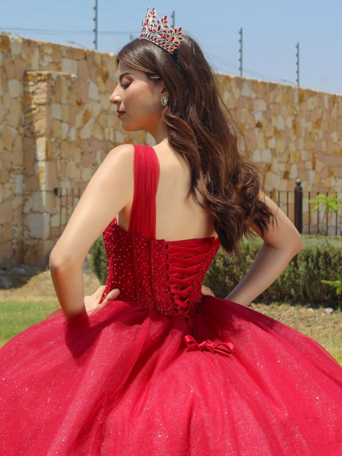 Sparkly Beading Ruched Lace Up Bodice Ball Gown Long Quinceanera Dress - Red