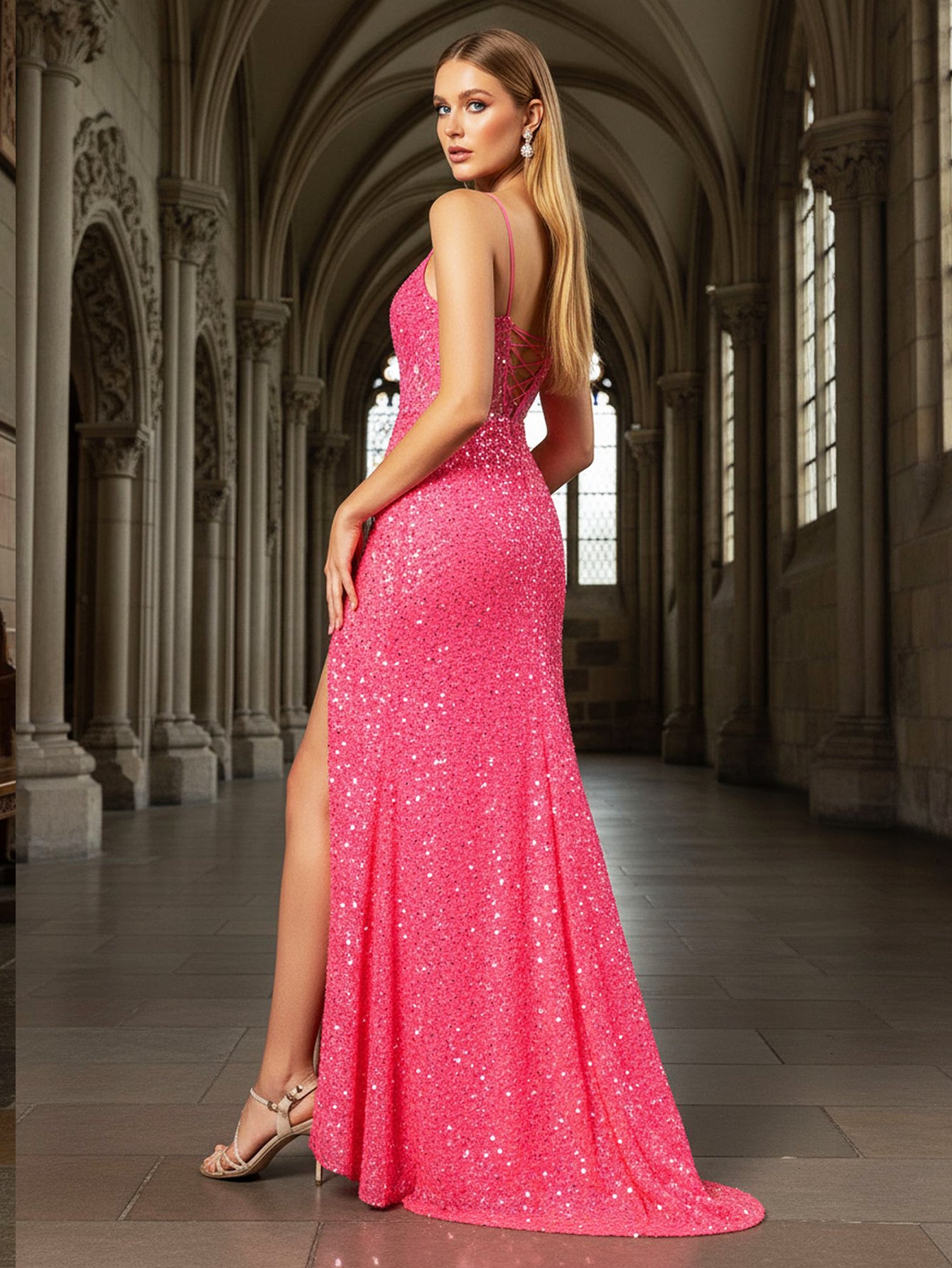 Details: Backless, Fitted Waist, Lace Up, Sheer, Sequin
