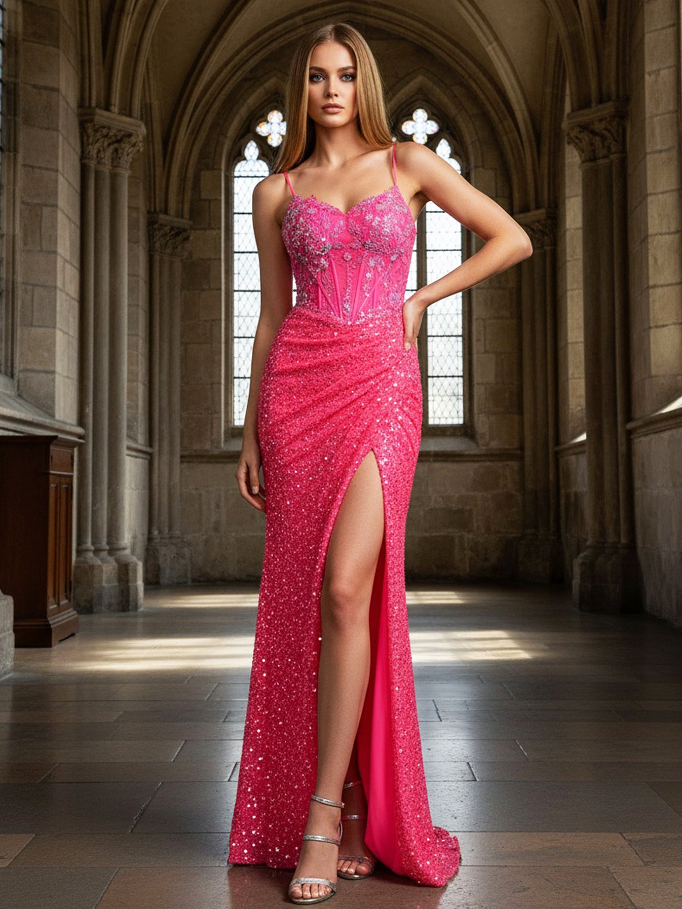 Sparkly Beading Sequin Embroidery Side Split Prom Dress - Hot Pink