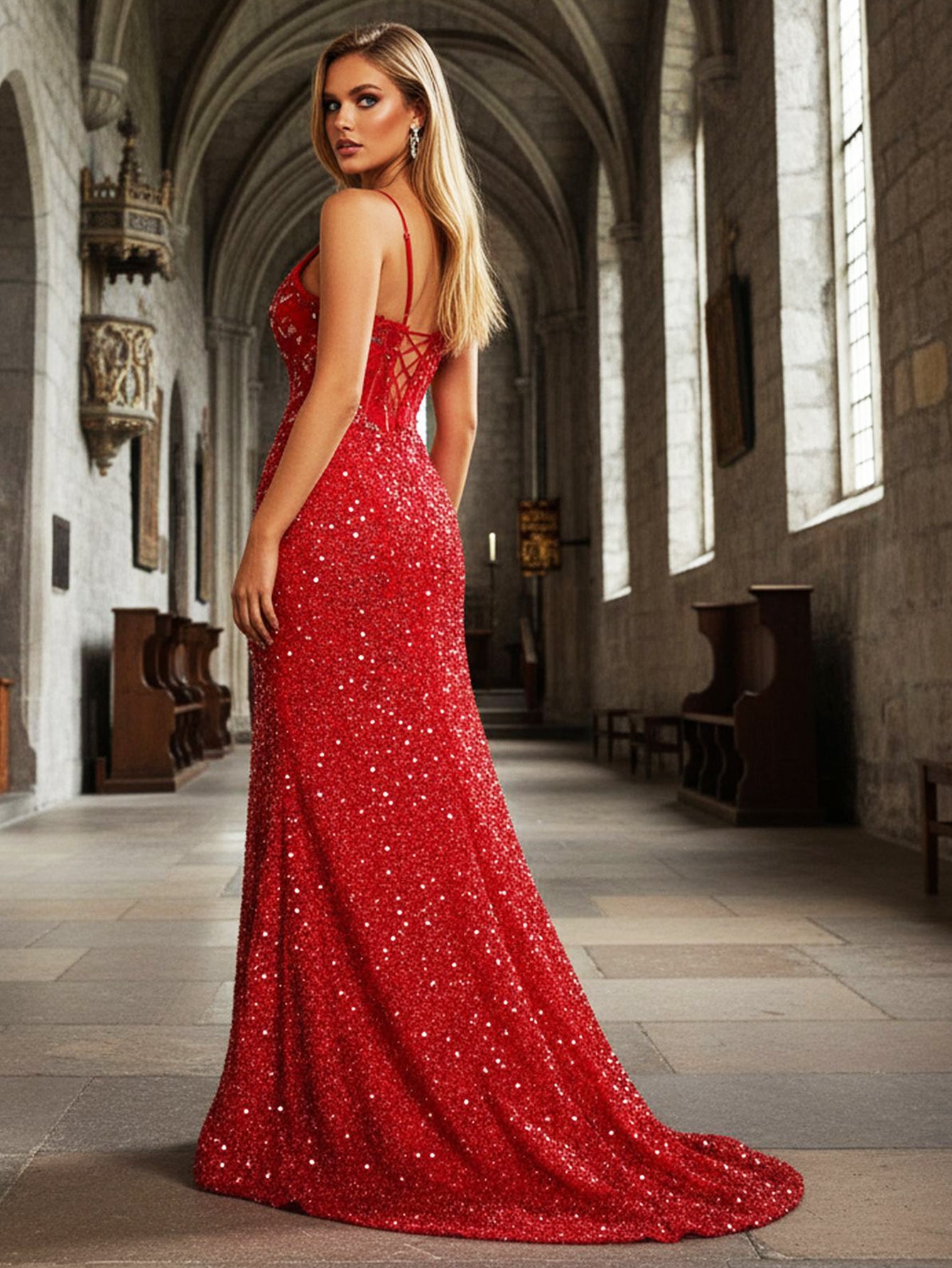 Sparkly Beading Sequin Embroidery Side Split Prom Dress - Red