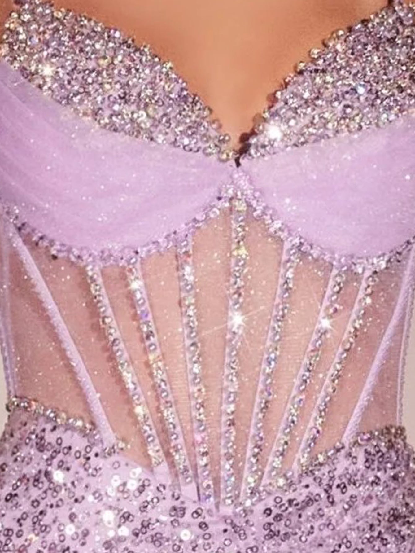 Sparkly Beading Spaghetti Strap Illusion Bodice Mermaid Prom Dress With Slit - Lilac