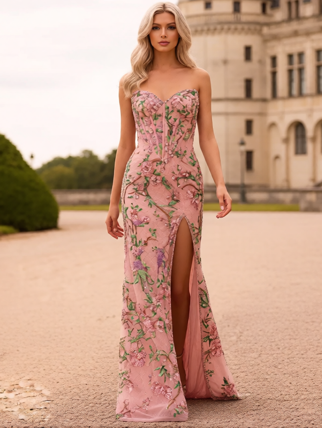 Details: Floral, Corset, Lace Up, Sparkly, Beading, Split