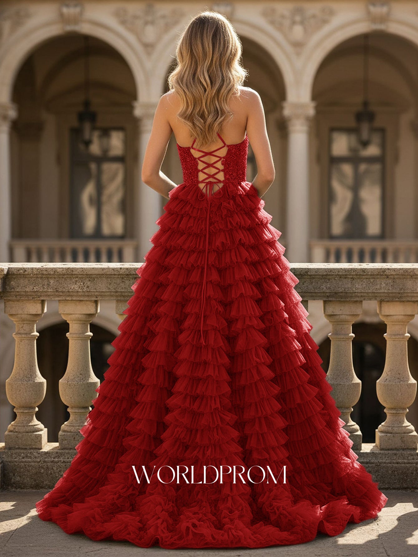 This tulle prom dress features embroidery lace up and criss cross back on the bodice. The spaghetti straps dress for prom has a v-neck and layered ruffle hem. This ball gown prom dress is ideal for party, evening, anniversary party, birthday party, cocktail, graduation party or homecoming events.