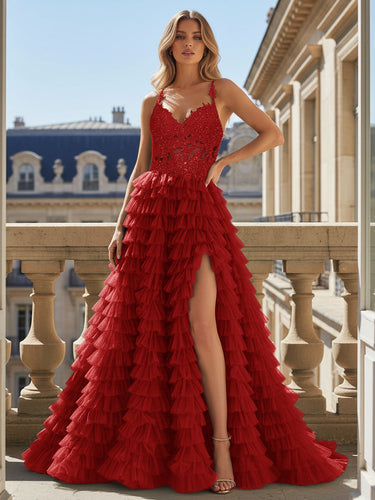Sparkly Bodice Spaghetti Strap Layered Slit Ball Gown Prom Dress - Red