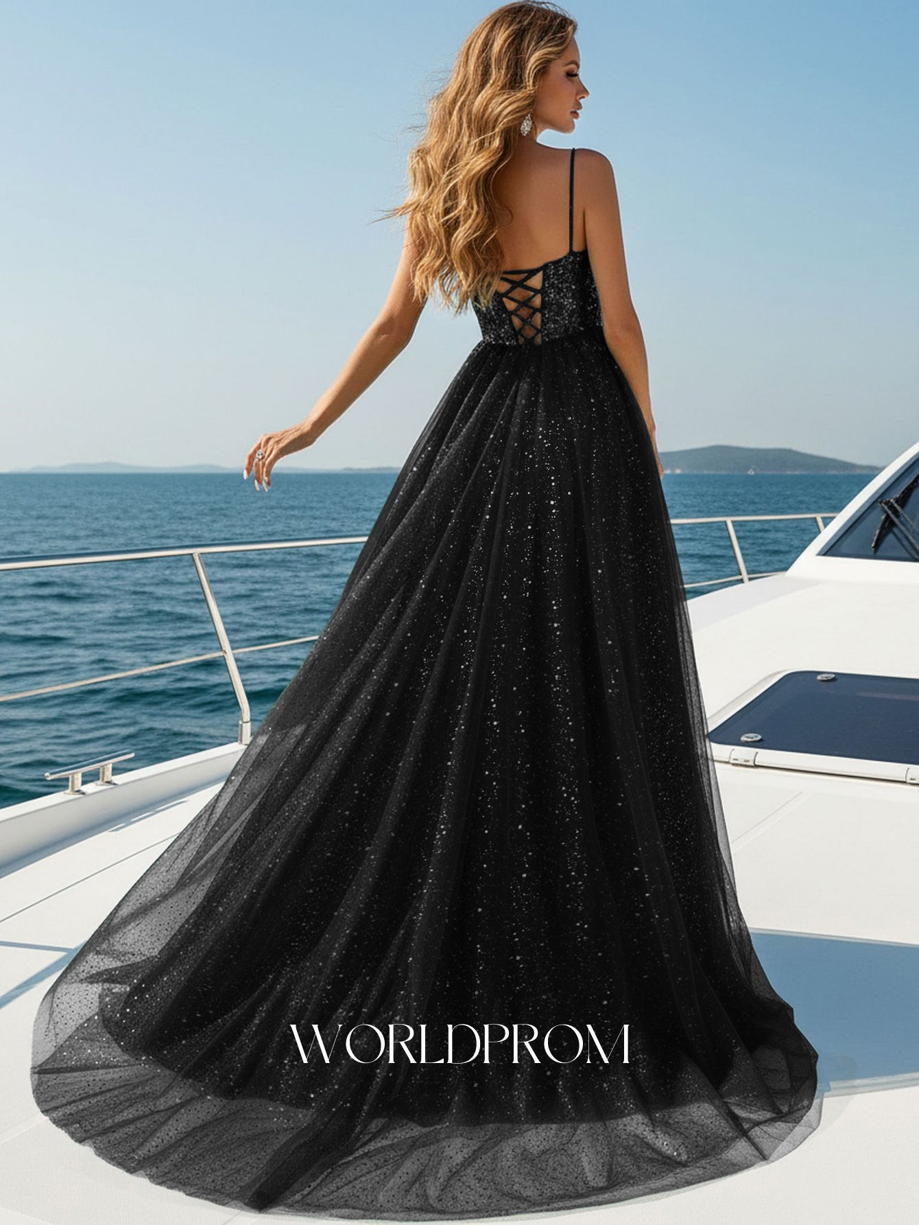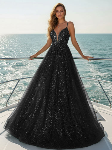 Sparkly Lace Deep V Neck Long Prom Dress - Black