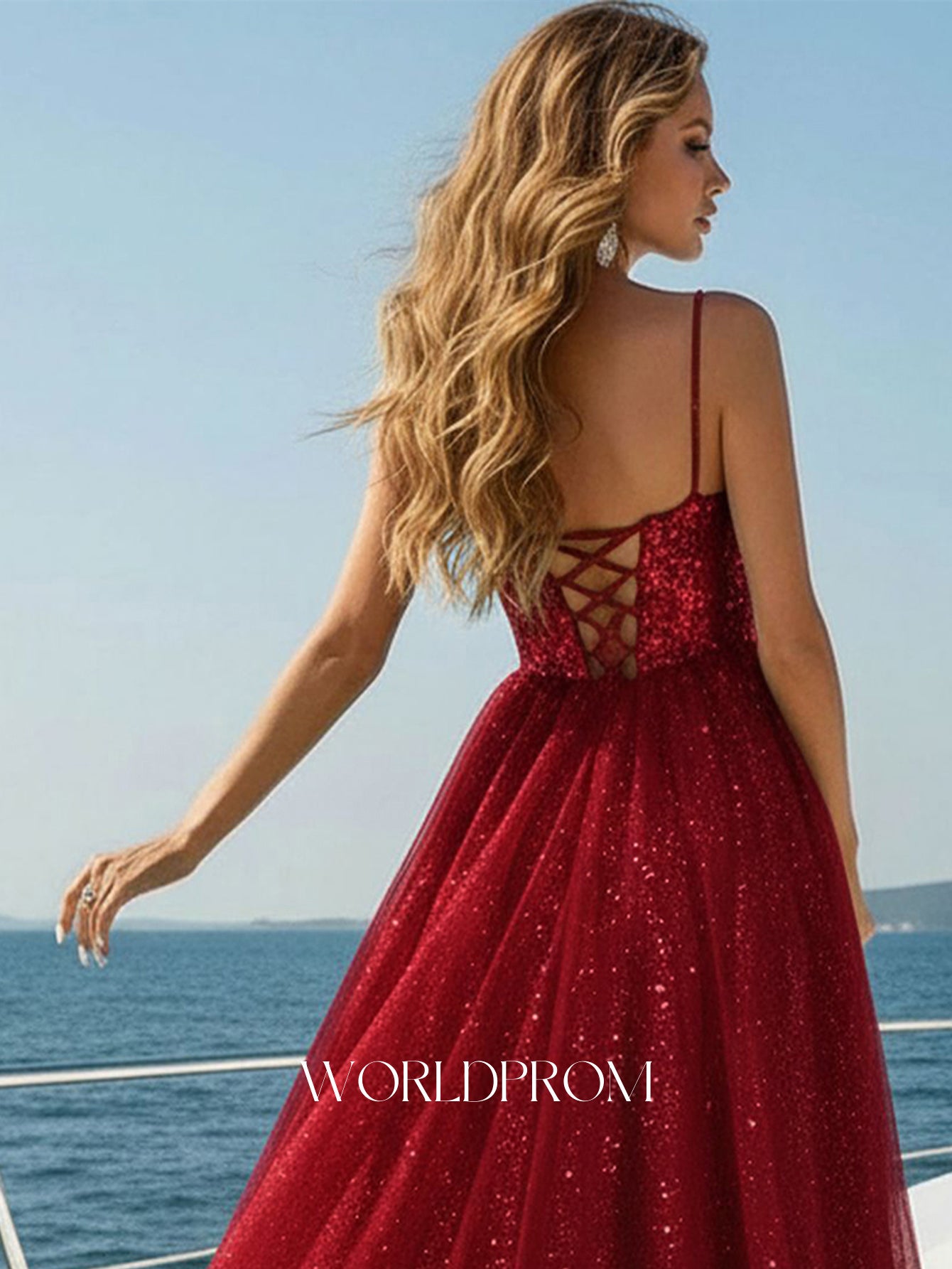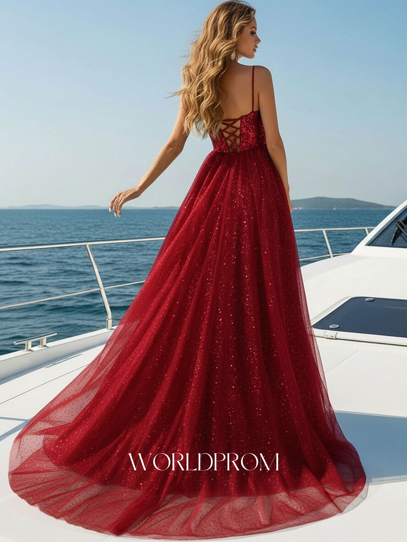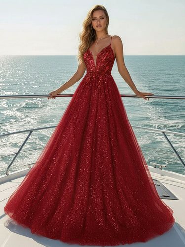 Sparkly Lace Deep V Neck Long Prom Dress - Red