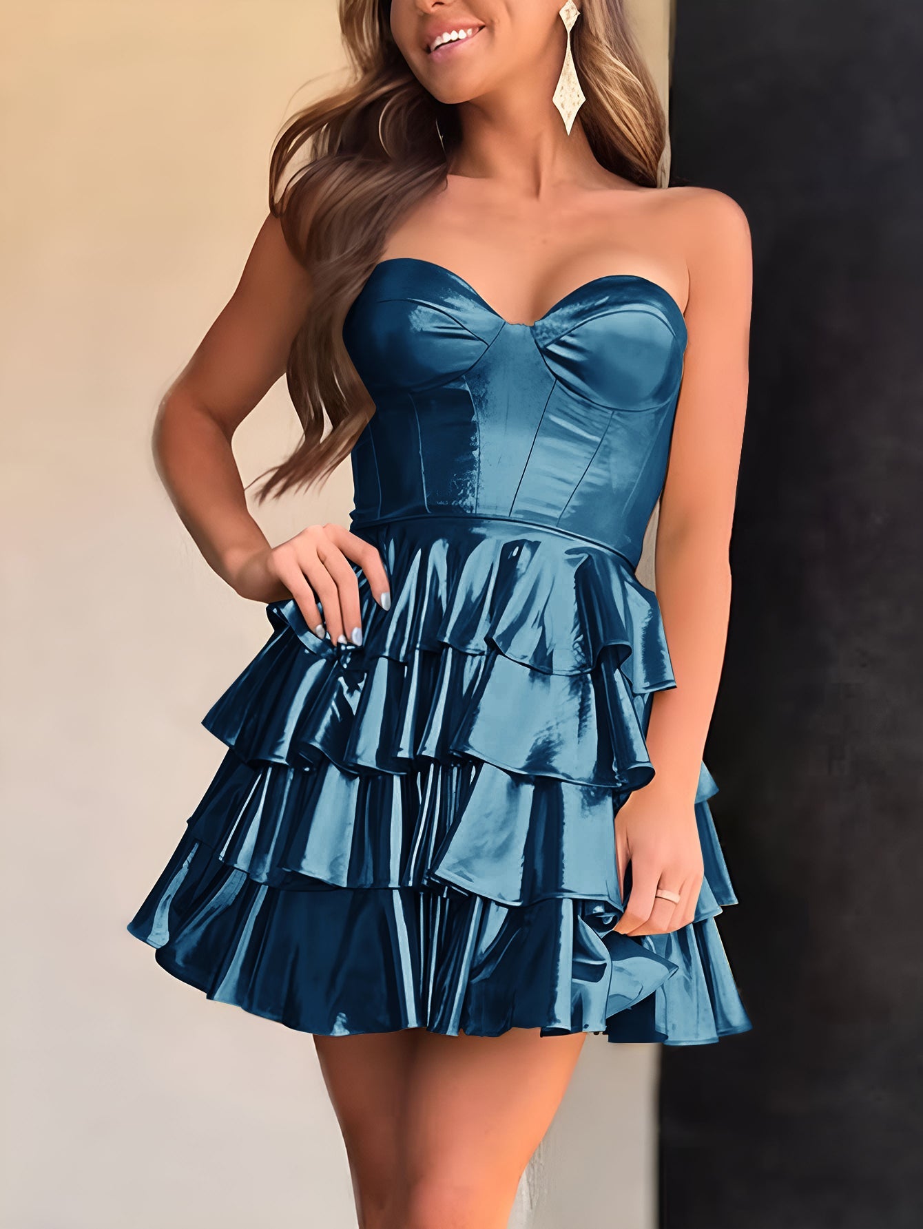 This satin short prom dress features boned pleated on the bodice. The strapless graduation dress has a sweetheart neck and ruffle hem. The sexy mini dress is ideal for high school or collage graduation party, homecoming or prom party.